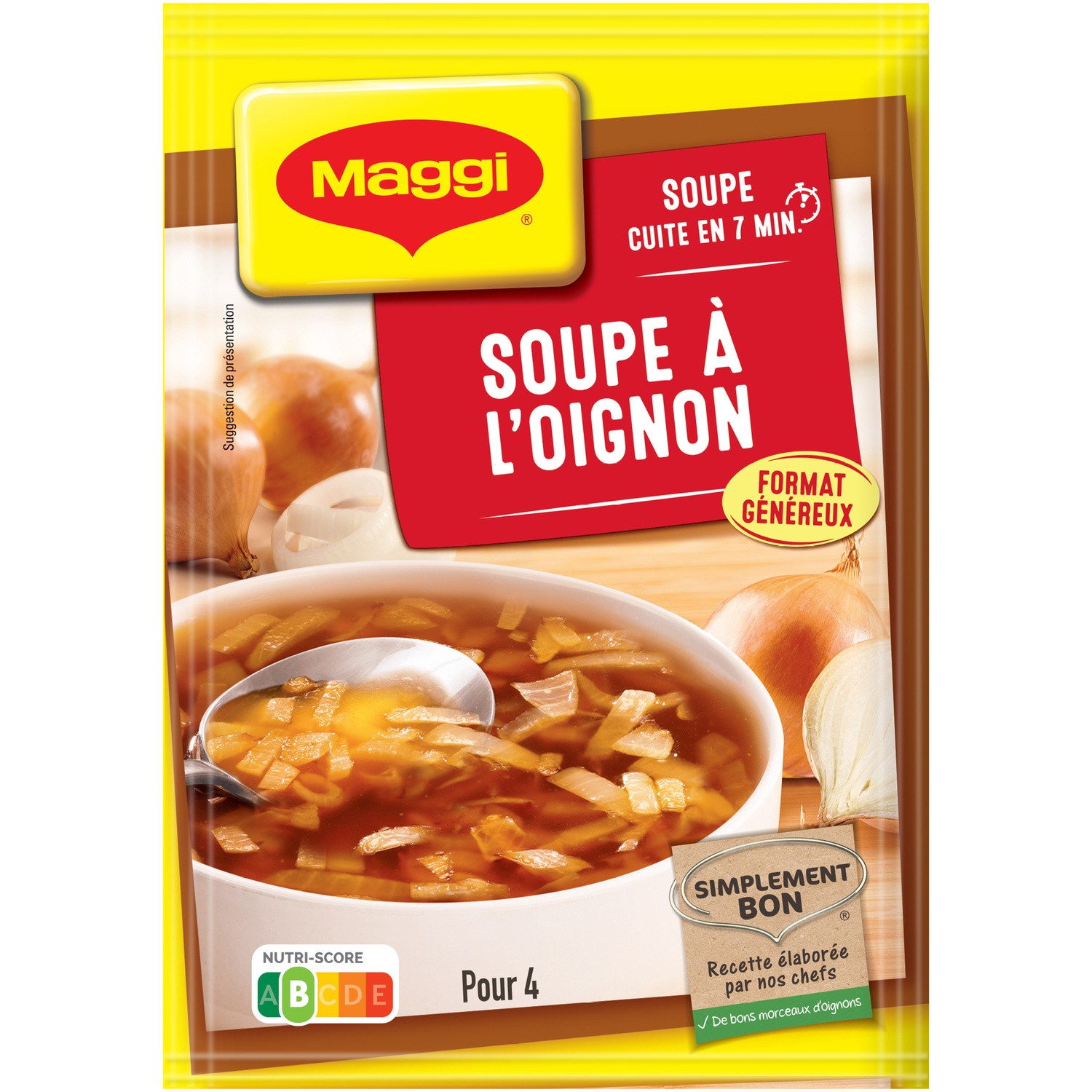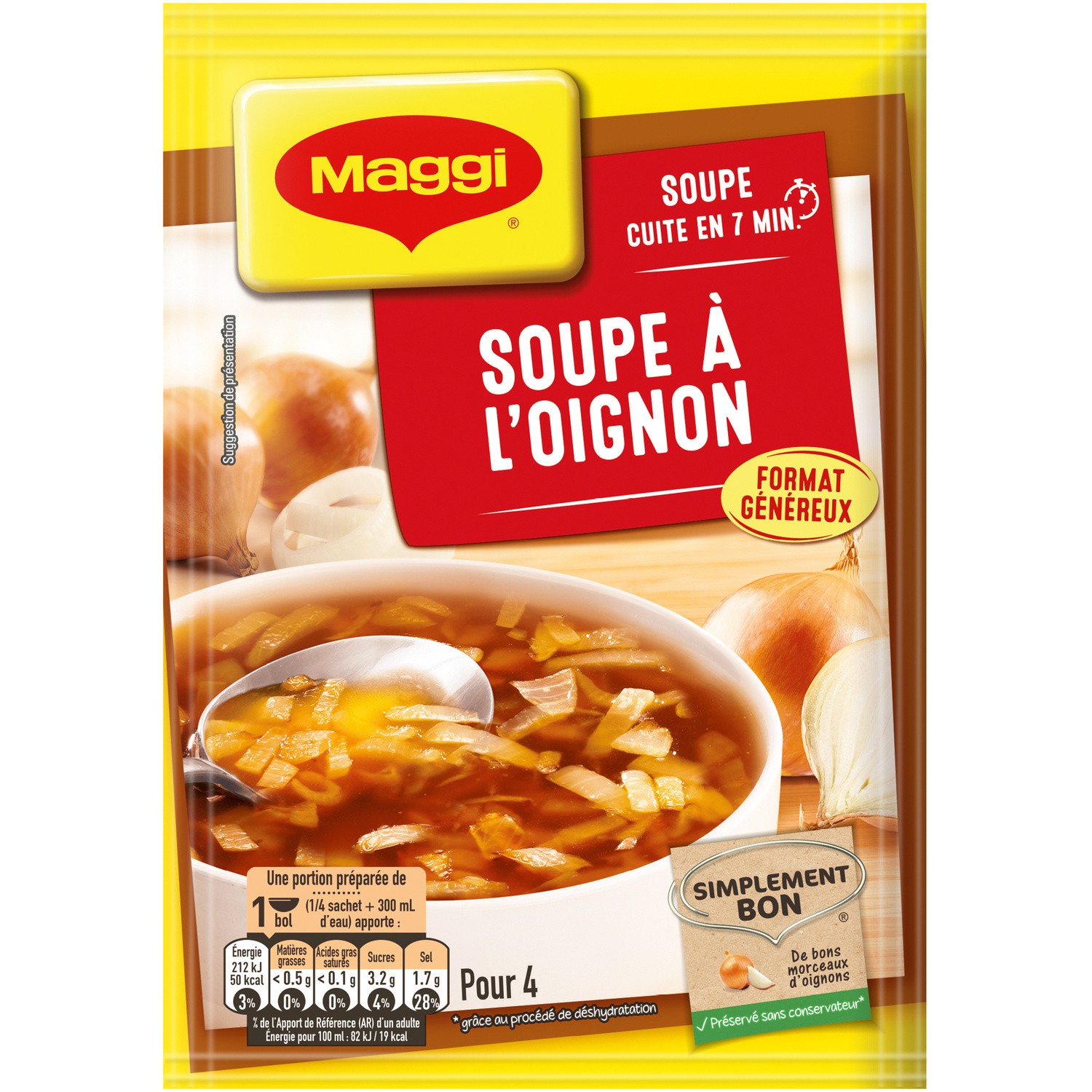 Soupe à l'oignon. Ingrédients : oignon (36%), fécule de mais, sucre, sel, arômes (blé), sucre caramélisé, extrait de levure, huile de tournesol. Peut contenir :...