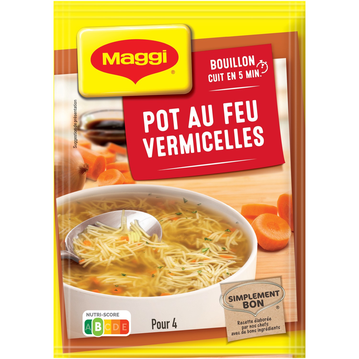 Bouillon Pot au Feu Vermicelles. Ingrédients : Vermicelles (semoule de blé dur) 66%, fécule de pomme de terre, sel, sirop de glucose, exhausteur de goût:...
