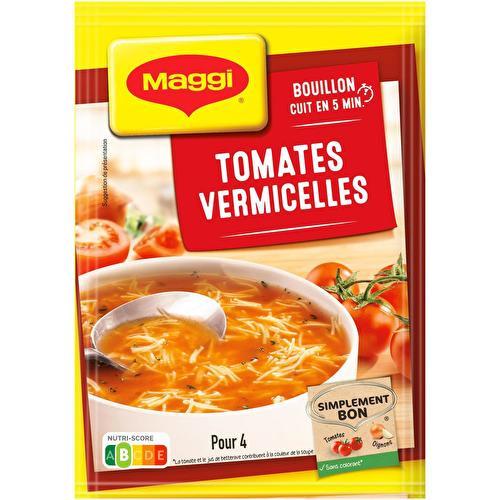 Soupe déshydratée tomates vermicelles. Ingrédients : Vermicelles 37% (semoule de _blé_ dur), farine de _blé_, tomate 16%, sel, fécule de pomme de terre, sucre, exhausteur...