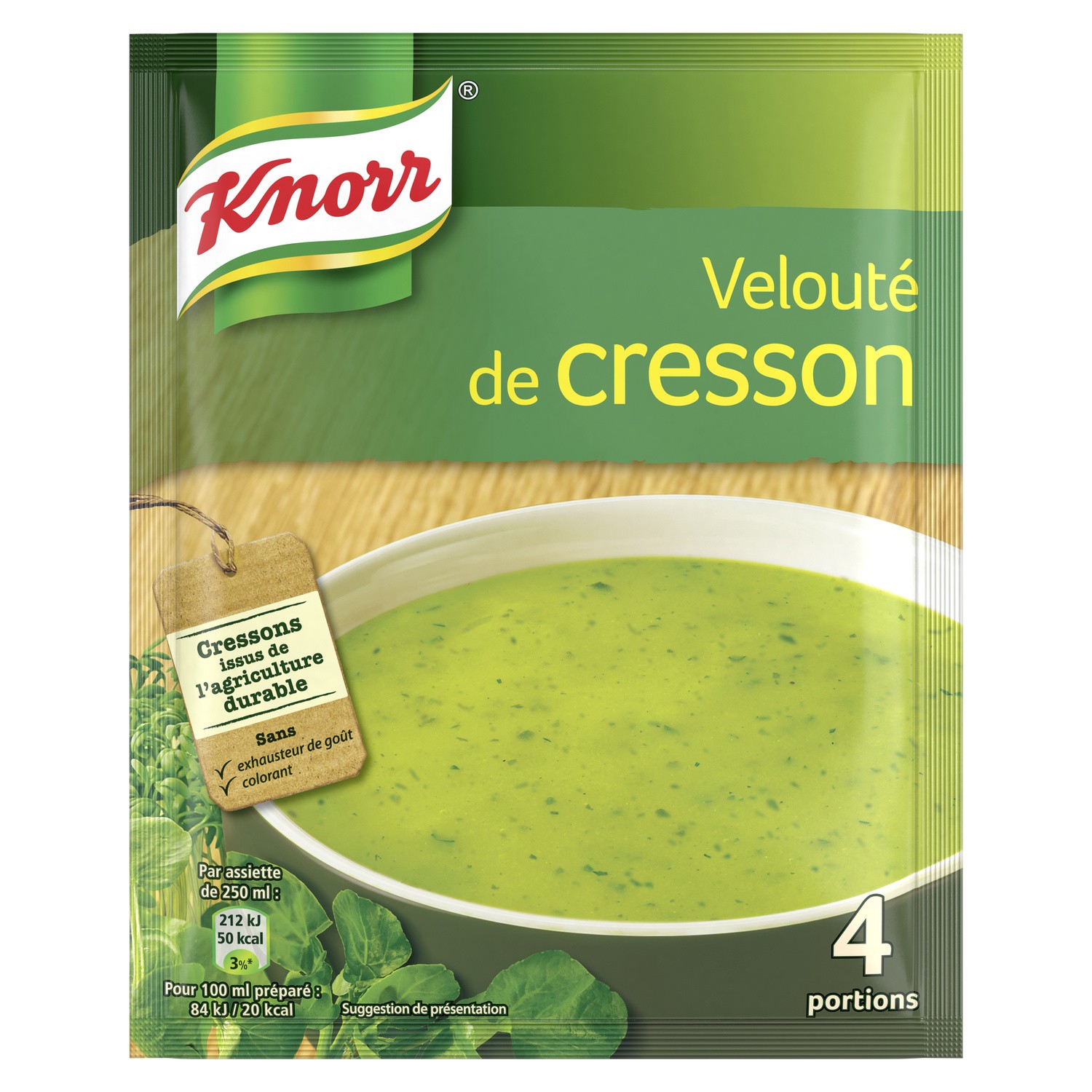 Soupe déshydratée.. Ingrédients : Fécule de pomme de terre, légumes² (pomme de terre : 22%, cresson : 2,3%, oignon : 1,8%), graisse de palme, sel,...
