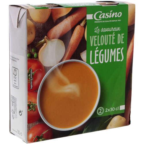 Velouté de legumes.Ingrédients : Eau, carotte 26%, poireau 10%, oignon 5,7%, pomme de terre 5,7 puree de tomates 2,1%, potiron, céleri-rave, beurre de cuisine, crème...