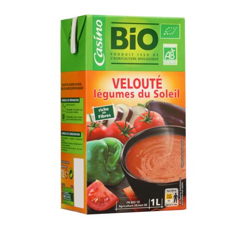 Velouté de légumes du Soleil, issu de l'agriculture biologique, Potage prêt à consommer.Ingrédients : Purée de tomates reconstituée* 40% - eau - poivrons rouges* 8%...