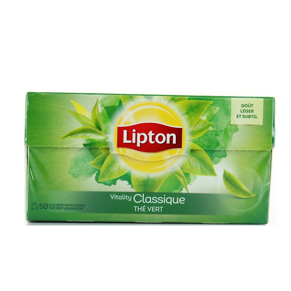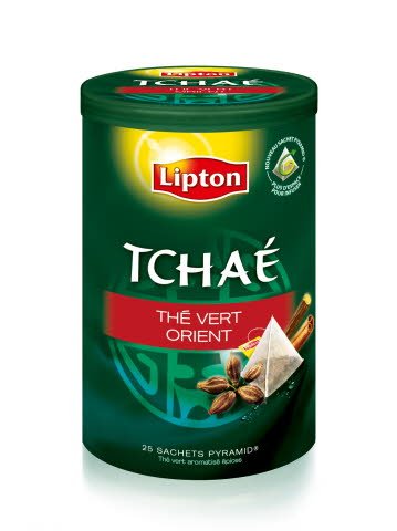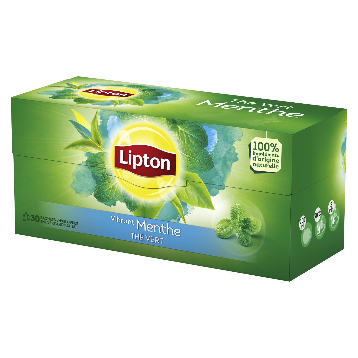 Thé vert aromatisé à la menthe.Ingrédients : Thé vert, menthe (21 %), arôme (15 %).Quantité : 40 gMarque : Lipton,Unilever