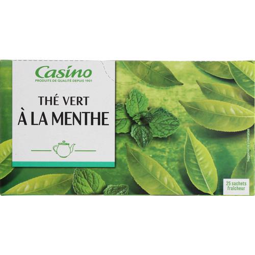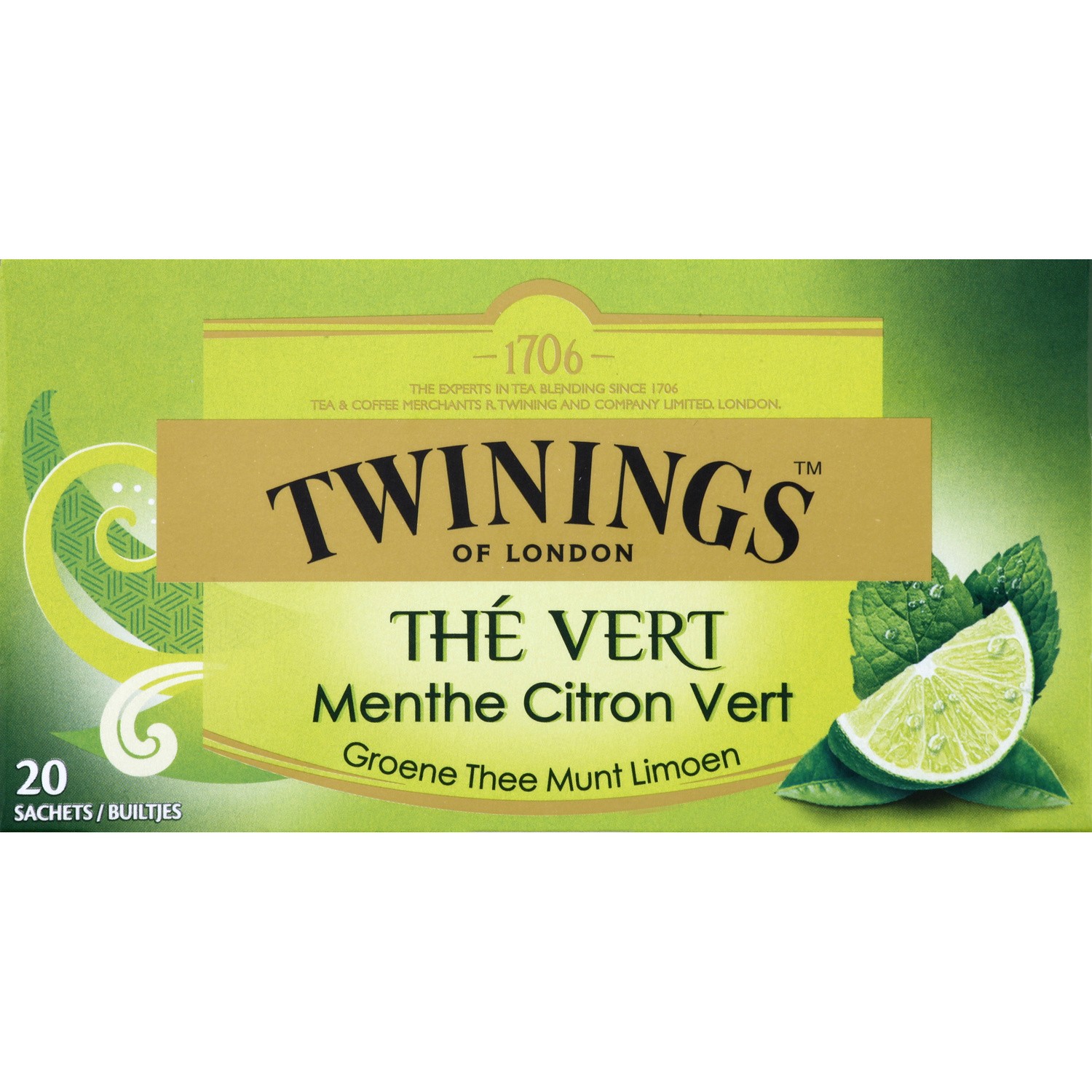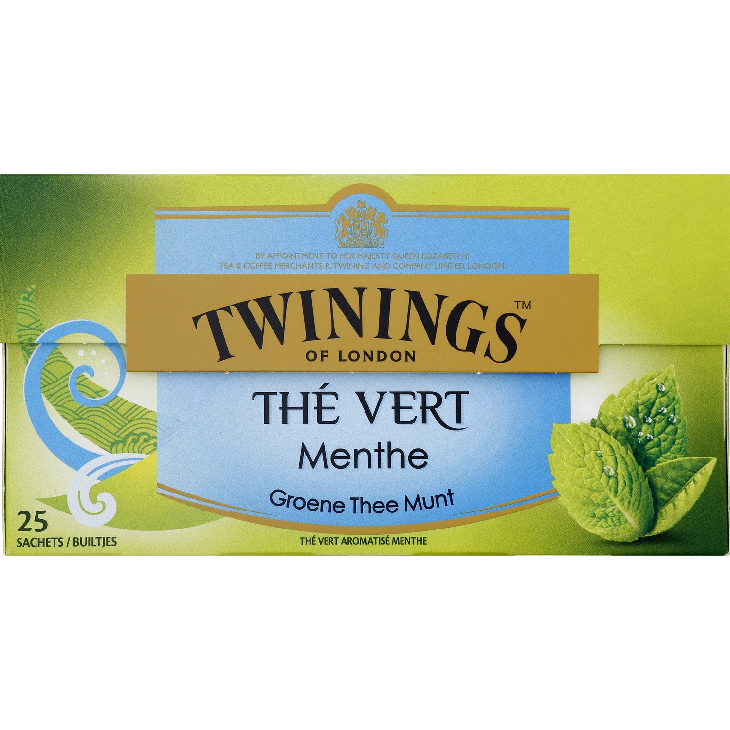 Twinning Thé Vert Menthe.Ingrédients : Thé vert (73%), feuilles de menthe douce (20%), arôme menthe (7%)Quantité : 30 g (25 sachets)Marque : Twinings