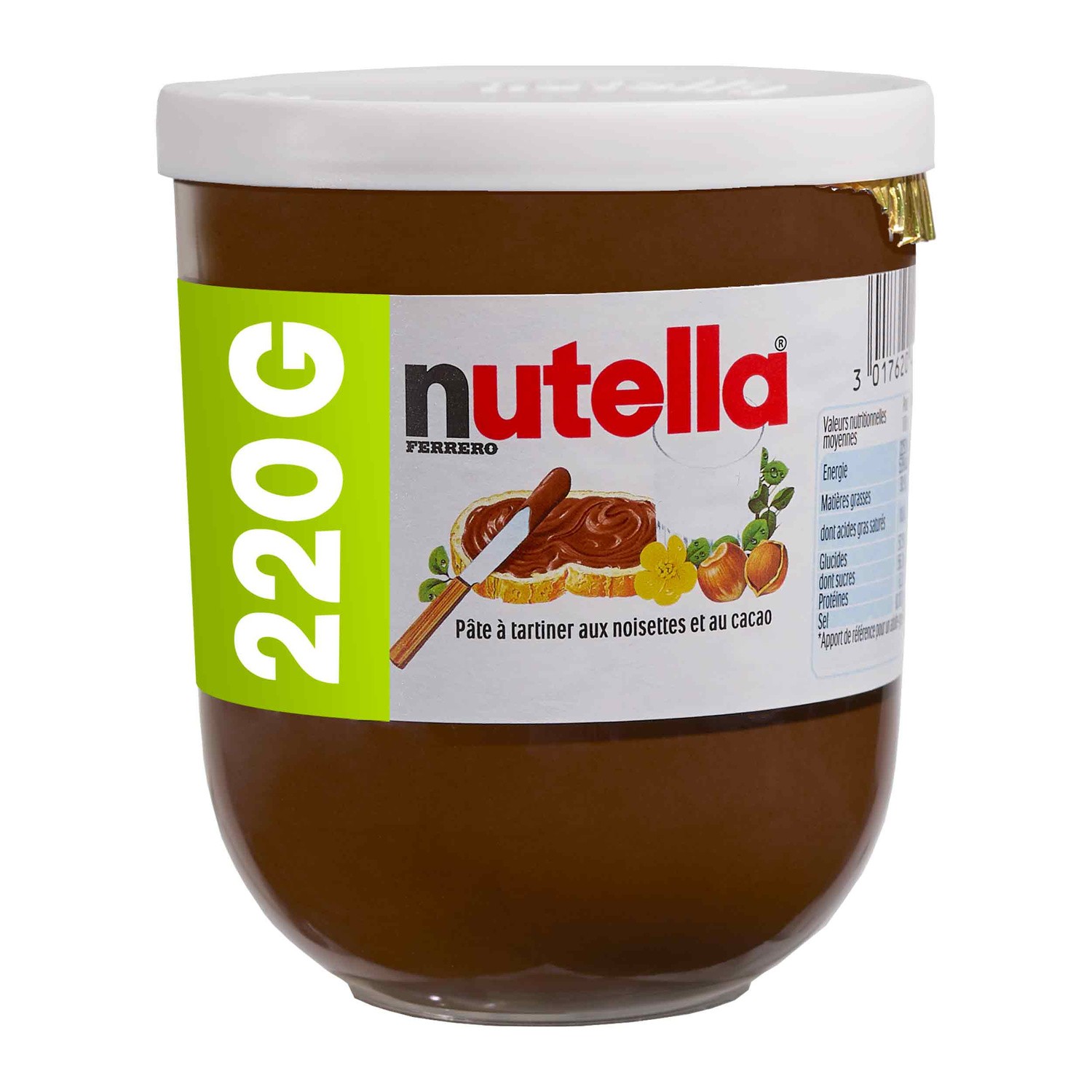 Nutella.Ingrédients : Sucre, huile de palme, noisettes 13%, cacao maigre 7,4%, lait écrémé en poudre 6,6%, lactoserum en poudre, émulsifiants : lécithines [soja], vanilline.Quantité :...