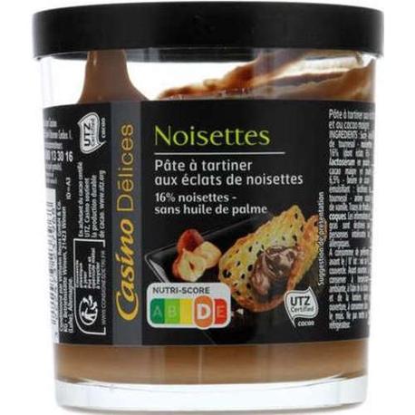 Pâte à tartiner aux éclats de noisettes.Ingrédients : Sucre - matière grasse végétale (huile de tournesol, beurre de cacao, huile de coco) - _noisettes_ 16%...