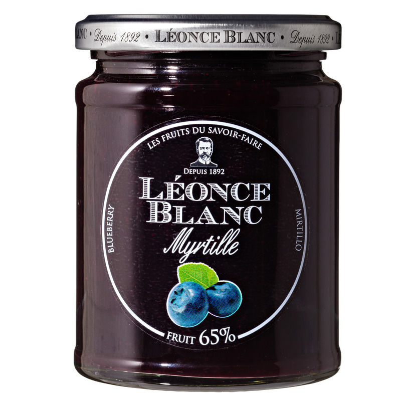 Préparation aux myrtilles. Ingrédients : Myrtilles 65%, sucre, gélifiant : pectine, acidifiant : acide citrique (si le fruit n'en contient pas suffisamment) Marque : Leonce...