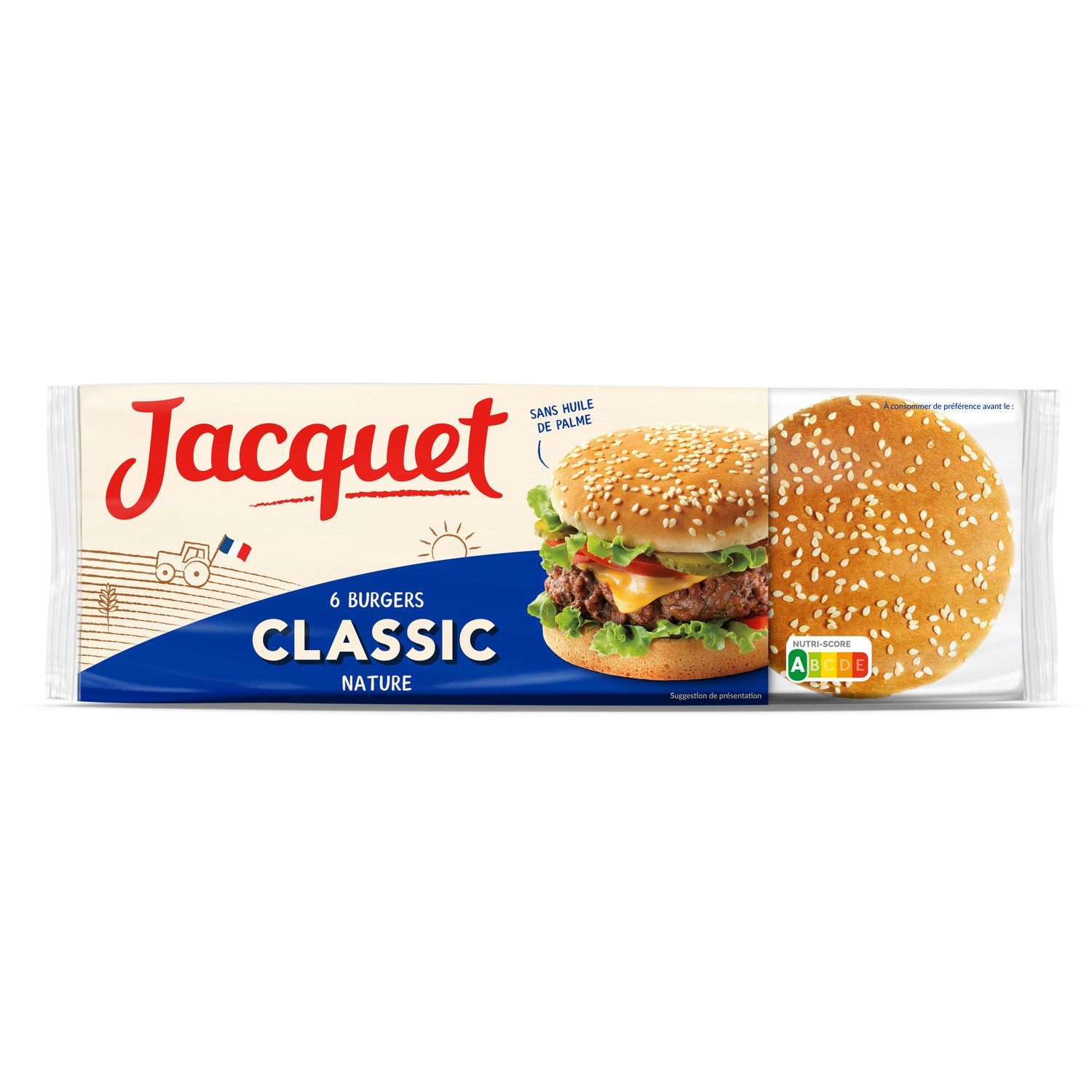Burger sésame géant.Ingrédients : Farine de BLÉ 59%, eau, levure, GRAINES DE SÉSAME 3,4%, sucre, huile de colza, arôme (contient alcool), sel, gluten de BLÉ,...