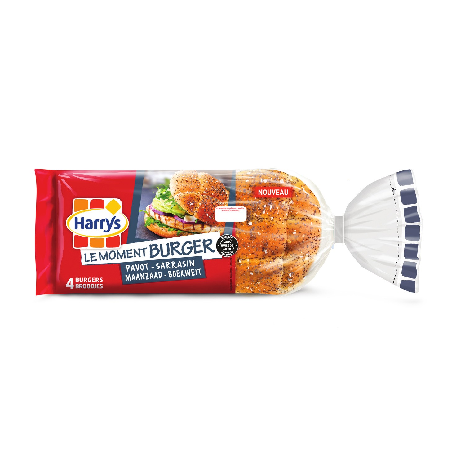 Pains spéciaux pour hamburgers.Ingrédients : Farine de BLÉ 61%, eau, levure, sucre, huile de colza, arôme (contient alcool), graines de pavot 1,1%, sarrasin 1,1%, sel,...