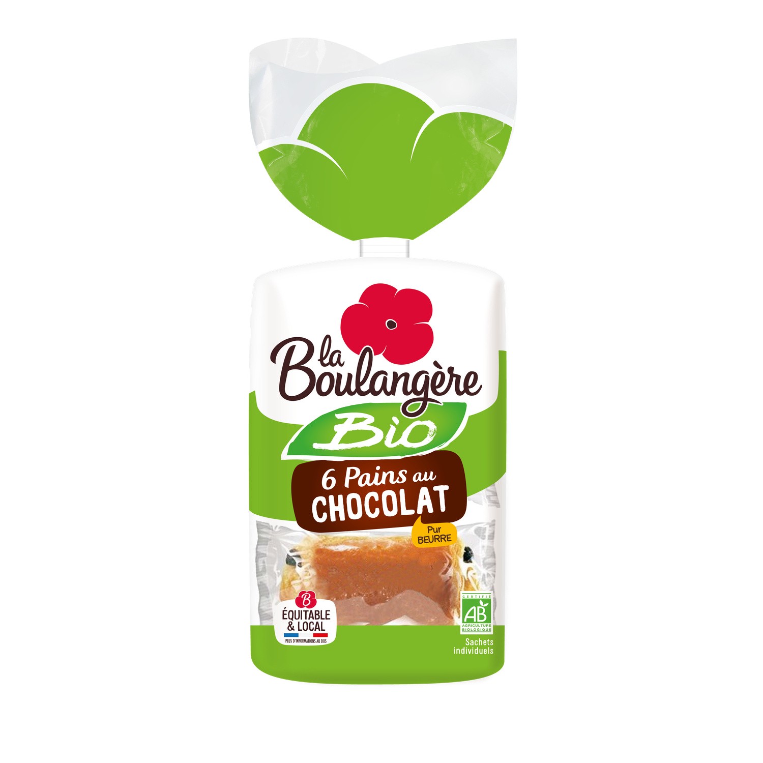 6 Pains au chocolat pur beurre Bio.Ingrédients : Farine de _blé_*/** 42%, _beurre_ 18,5%, chocolat* 14% (pâte de cacao*, sucre*, beurre de cacao*, émulsifiant :...
