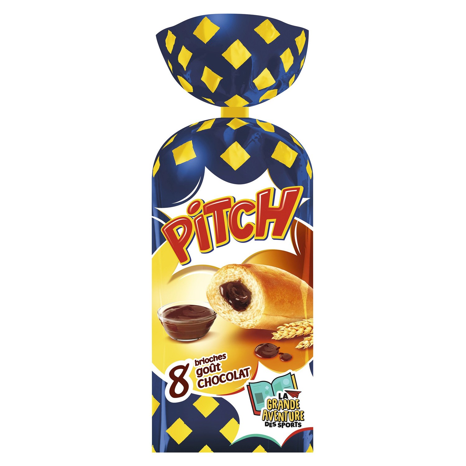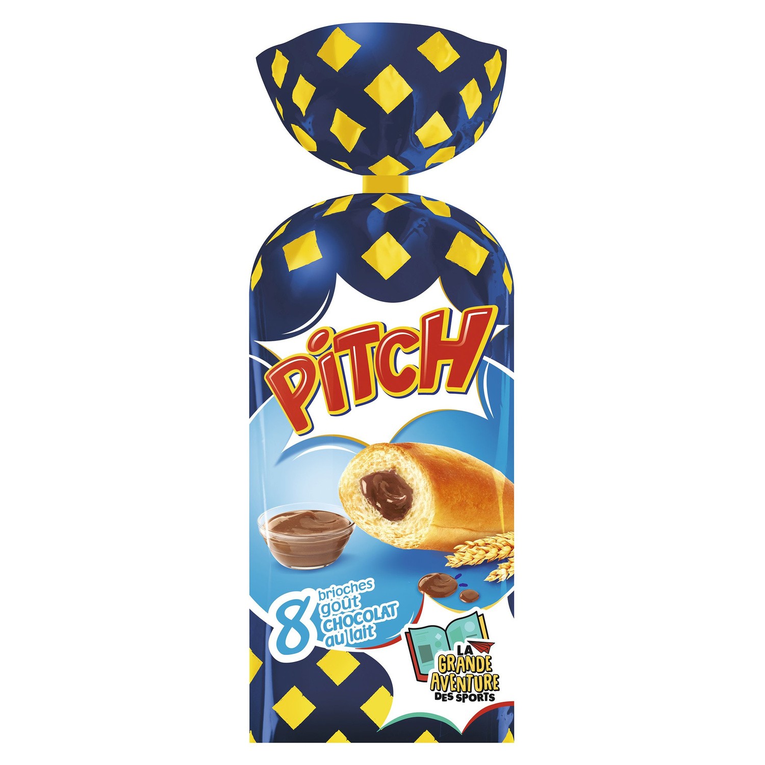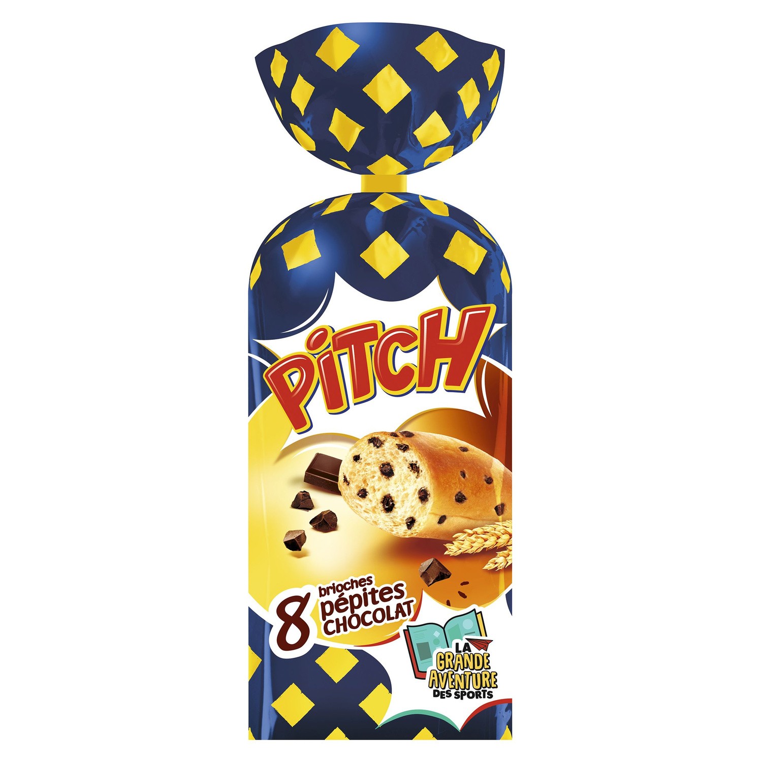 Pitch - 8 Brioches Pépites Chocolat.Ingrédients : Farine de _blé_ 38 %, pépites de _chocolat_ 13,5 % (sucre, masse de cacao, beurre de cacao, émulsifiant...