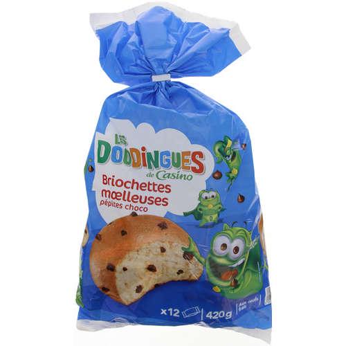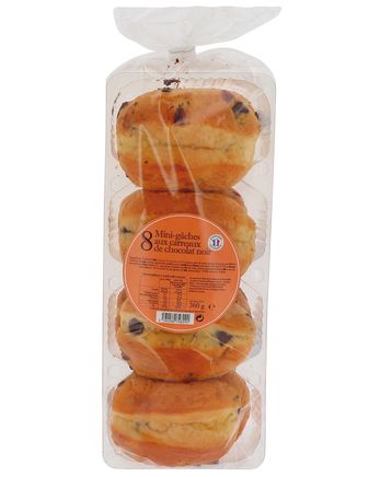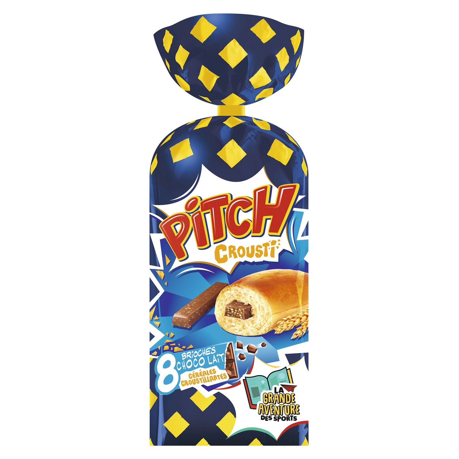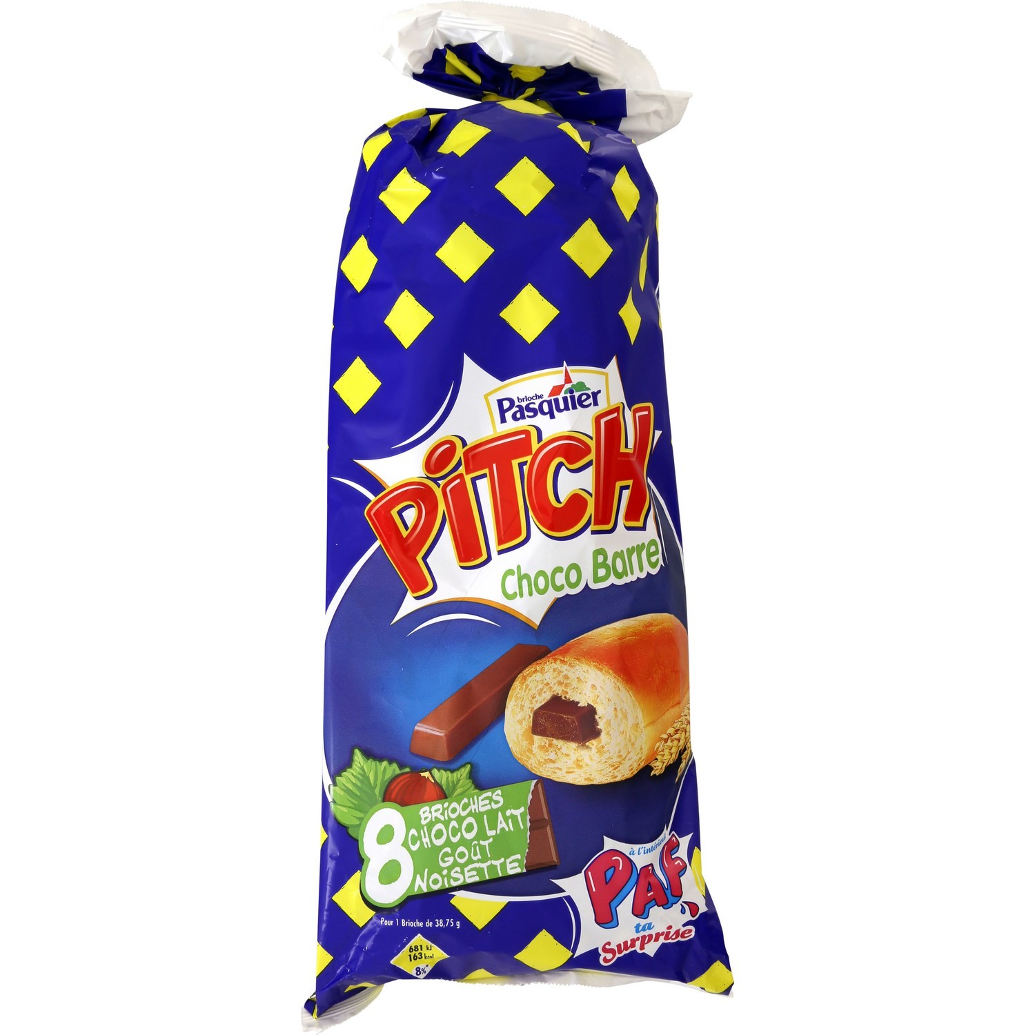 Pitch - 8 Brioches Pépites Chocolat.Ingrédients : Farine de _blé_ 38 %, pépites de _chocolat_ 13,5 % (sucre, masse de cacao, beurre de cacao, émulsifiant...