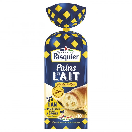 10 Pains au lait.Ingrédients : Farine de _blé_ - sucre - _oeufs_ frais 10,8% - huile de colza - _beurre_ concentré - émulsifiants: mono -...