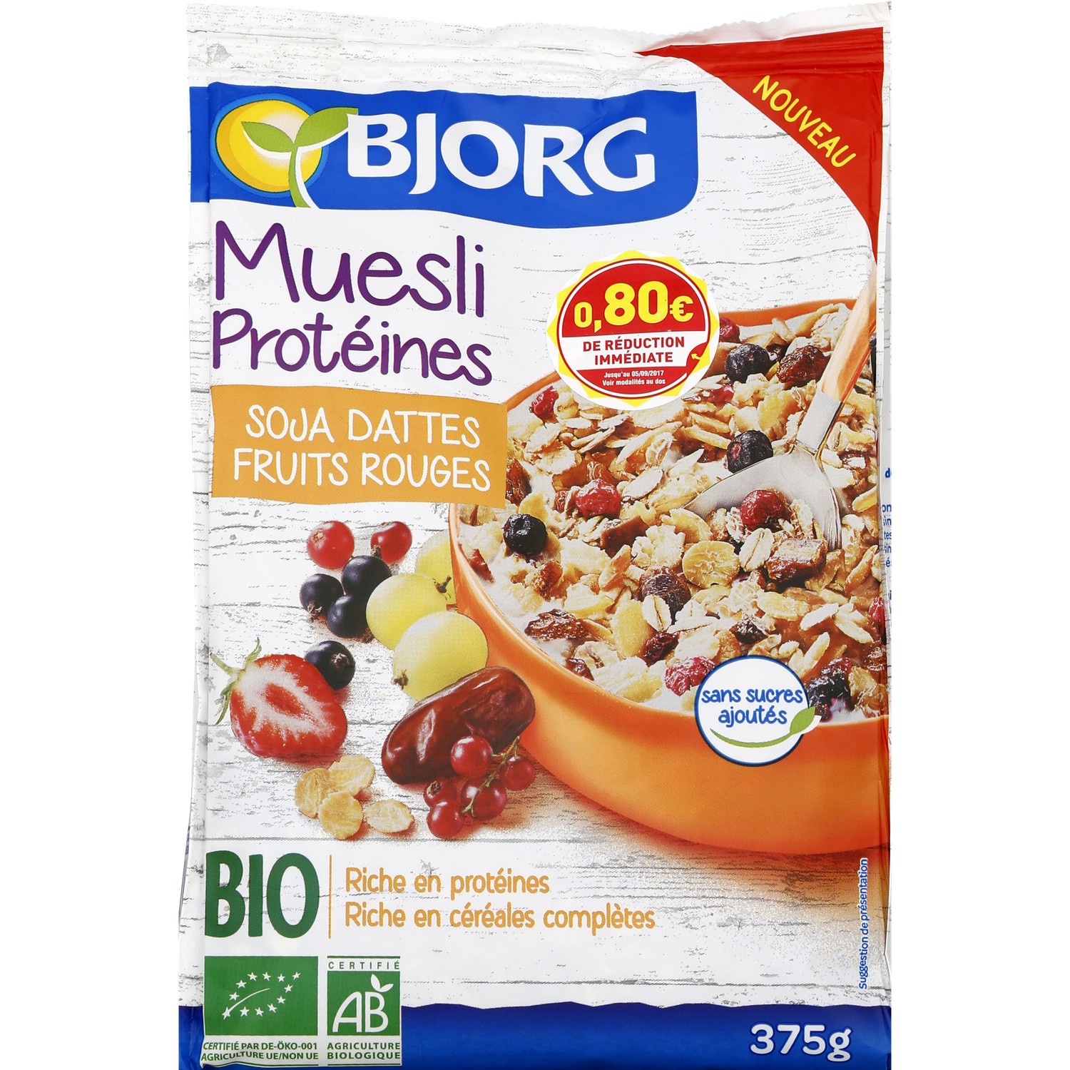 Muesli aux protéines de soja et aux dattes. Ingrédients : Flocons de soja* 33%, flocons d'avoine 26%, flocons de blé 25%, raisins secs* 8% (raisins*,...