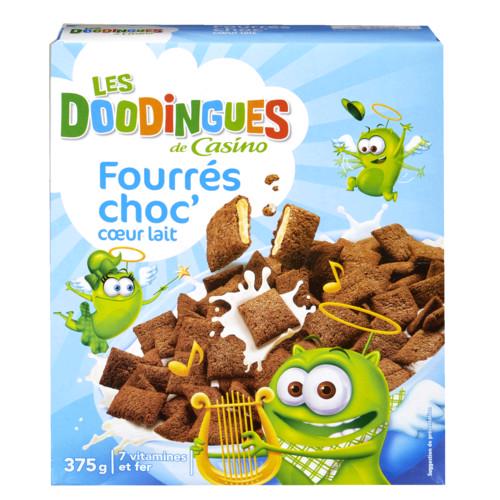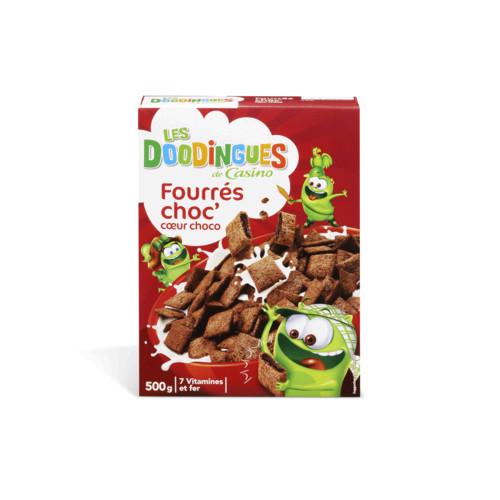 Coussins aux 3 céréales fourrés au chocolat au lait. Ingrédients : Farines de céréales (_BLÉ_ {26%}, _AVOINE_ {17%}, riz {12%}), fourrage au chocolat au lait...