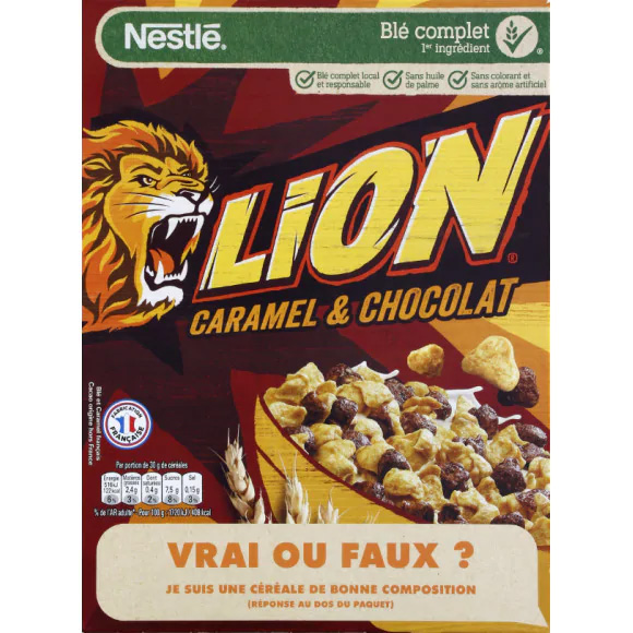 Céréales Lion. Ingrédients : Céréales 60,5% (_blé_ complet (35,7%), farine de _blé_, farine de riz), sucre, sirop de glucose, caramel 6,4% (_lait_ écrémé concentré sucré...