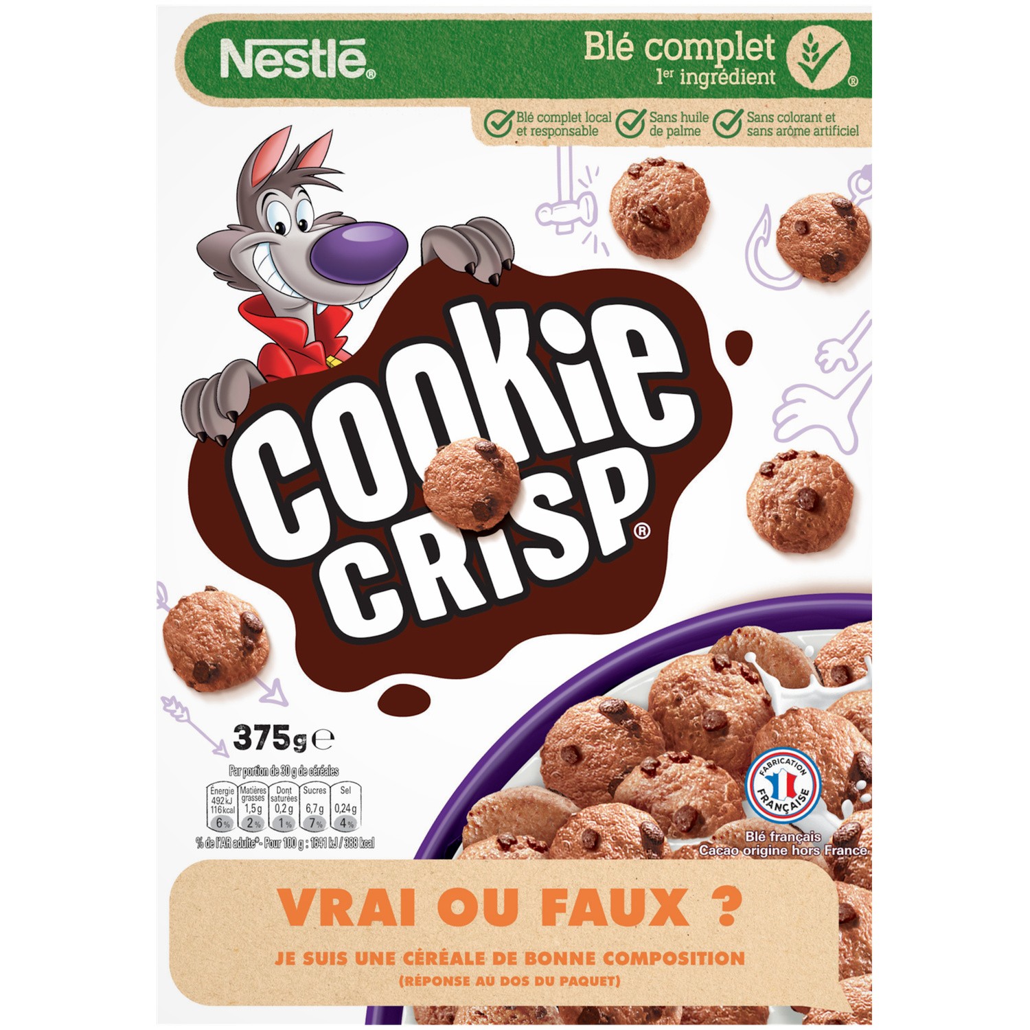 Céréales au goût de biscuit avec des pépites saveur chocolat. Ingrédients : Céréales (blé complet, semoule de maïs), sucre, sirop de glucose, amidon de blé,...