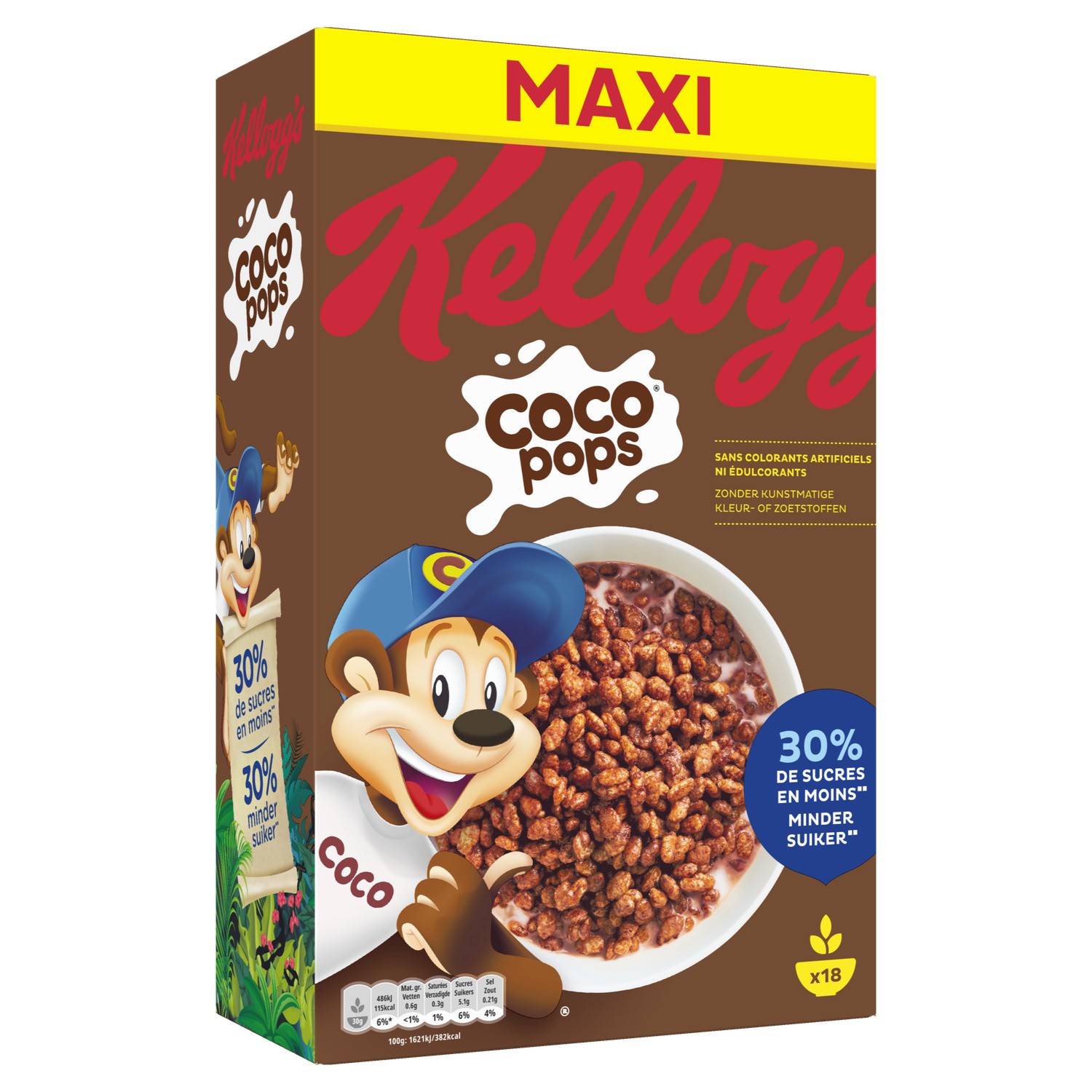 Coco pops. Ingrédients : Riz, Sirop de glucose, Sucre, Cacao maigre en poudre, Pâte de cacao, Sel, Extrait de malt d'_orge_, Arômes. VITAMINES ET MINÉRAUX:...