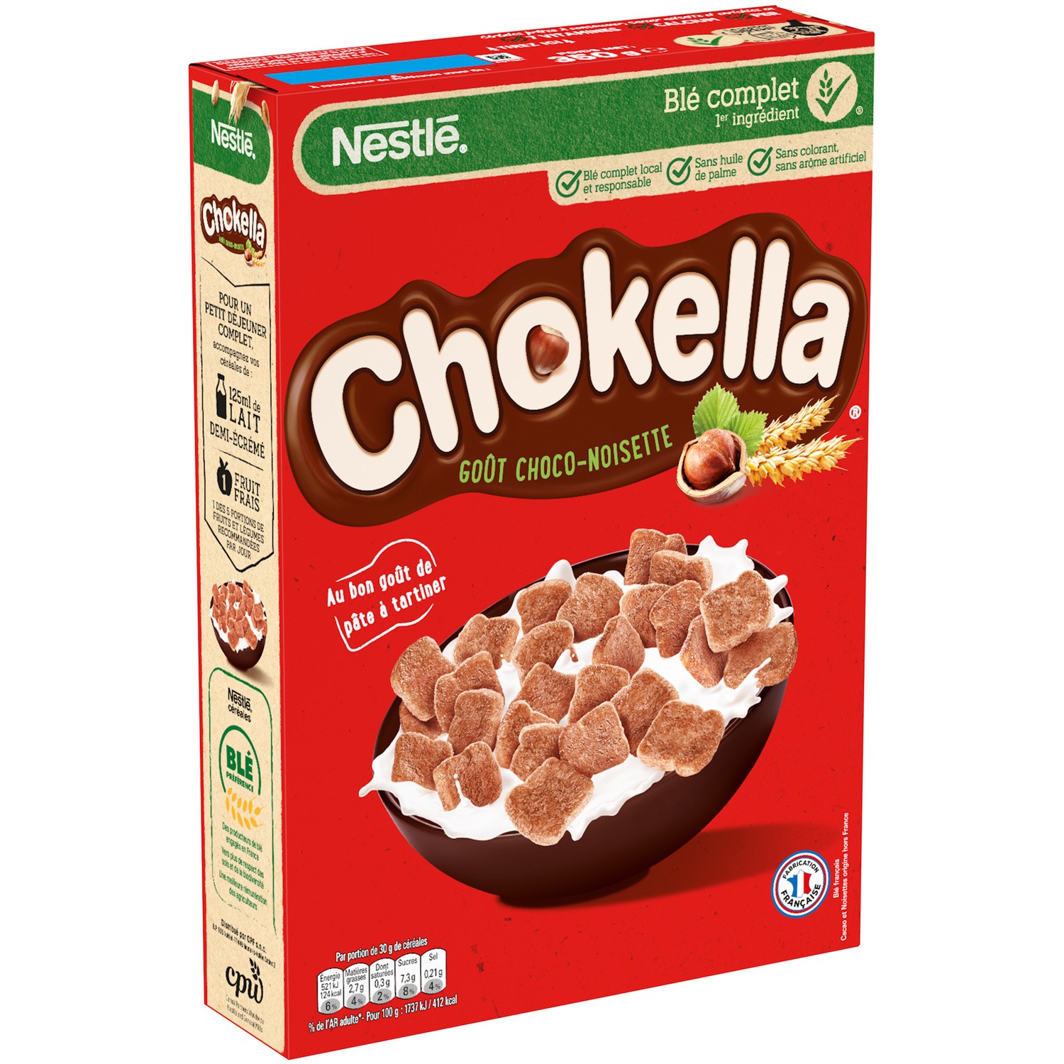 Céréales avec du blé complet goût choco-noisette. Ingrédients : Céréales 55,5% (farine de blé complet 31,4%, semoule de maïs), pâte à tartiner noisette cacao 18%...