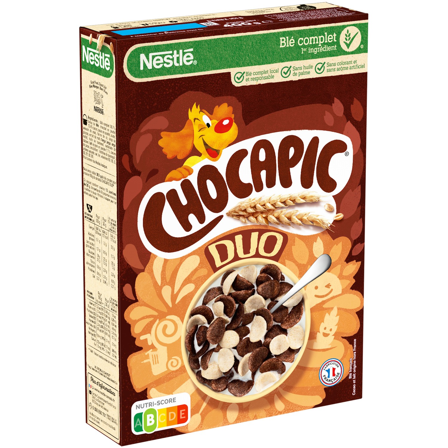 Chocapic Duo. Ingrédients : Céréales 64,8% (_blé_ complet 36,3%, farine de _blé_, semoule de maïs, farine de riz), sucre, chocolat en poudre 13,4% (sucre, cacao...