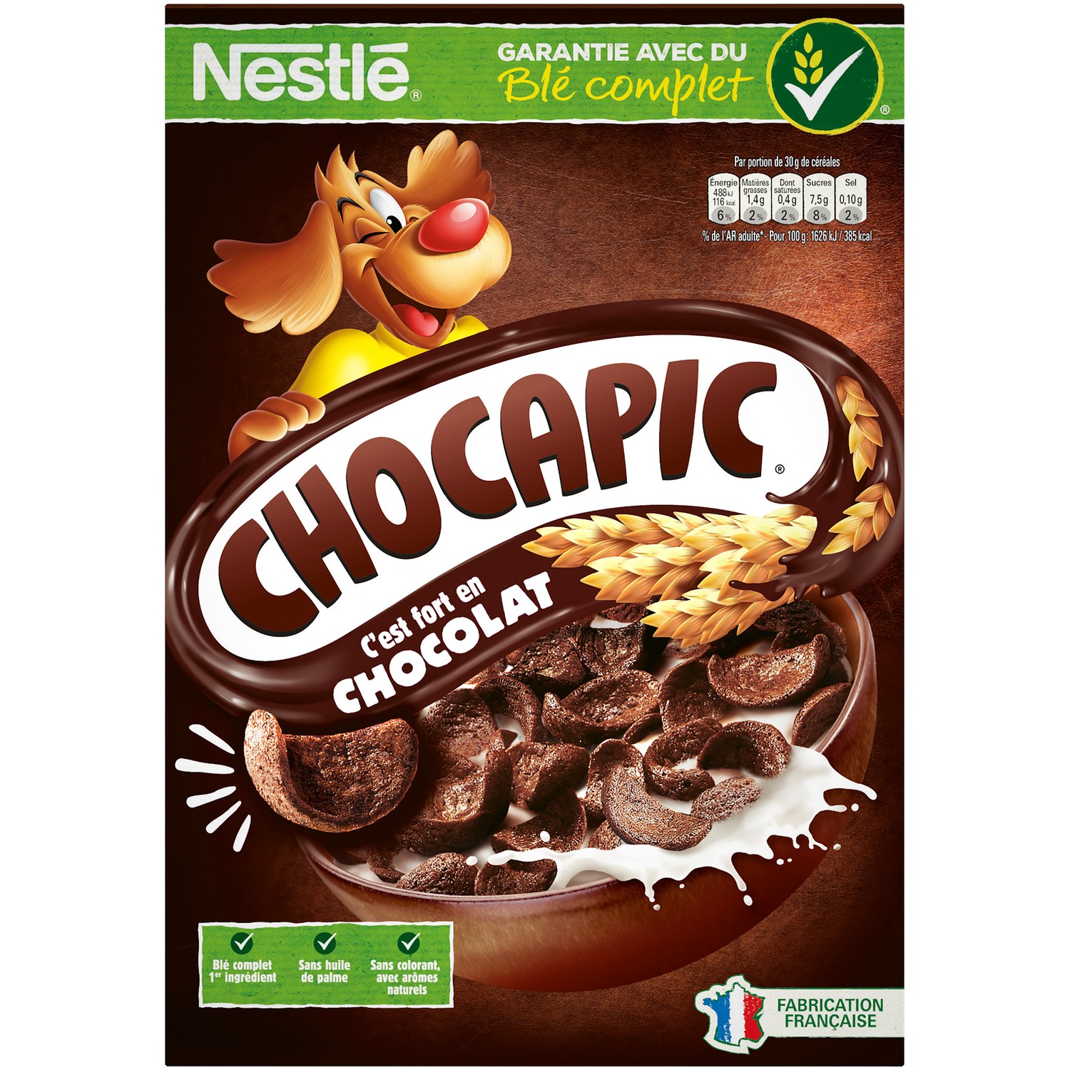 Céréales au blé complet. Ingrédients : _blé_ complet 33,5%, chocolat en poudre 22,8% (sucre, cacao en poudre), farine de _blé_ 16,8%, semoule de maïs, sirop...
