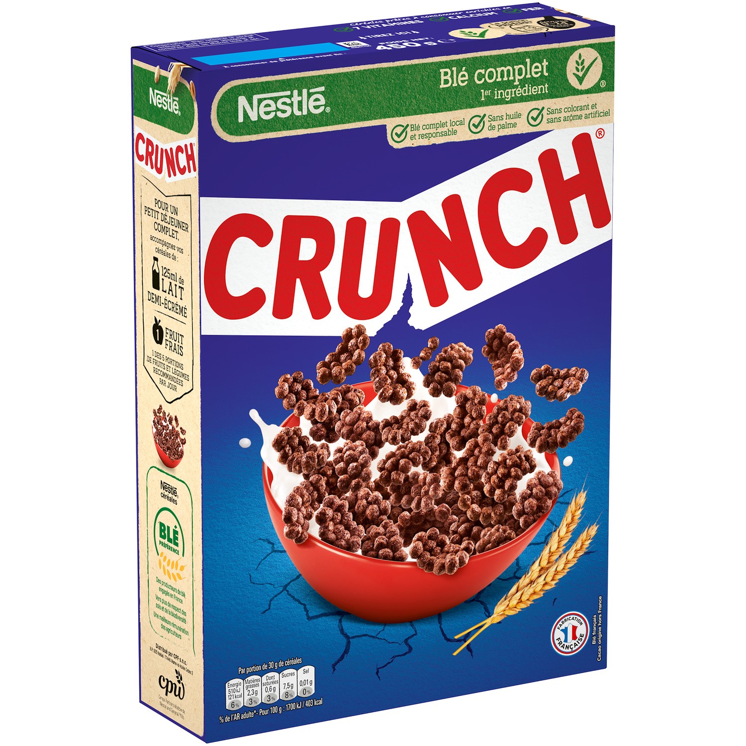 Crunch. Ingrédients : Céréales 62.8% (_blé_ complet 29.4%, farine de riz, semoule de mais), sucre, chocolat 12.6% (cacao maigre en poudre, sucre, pâte de cacao)....
