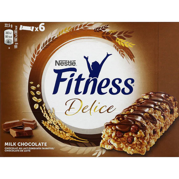 Fitness Délice Milk Chocolate. Ingrédients : Céréales 51,2% (blé complet 20,1%, riz, flocons d'avoine complète 11,2%, farine de blé complet 4,4%, semoule de mais, farine...