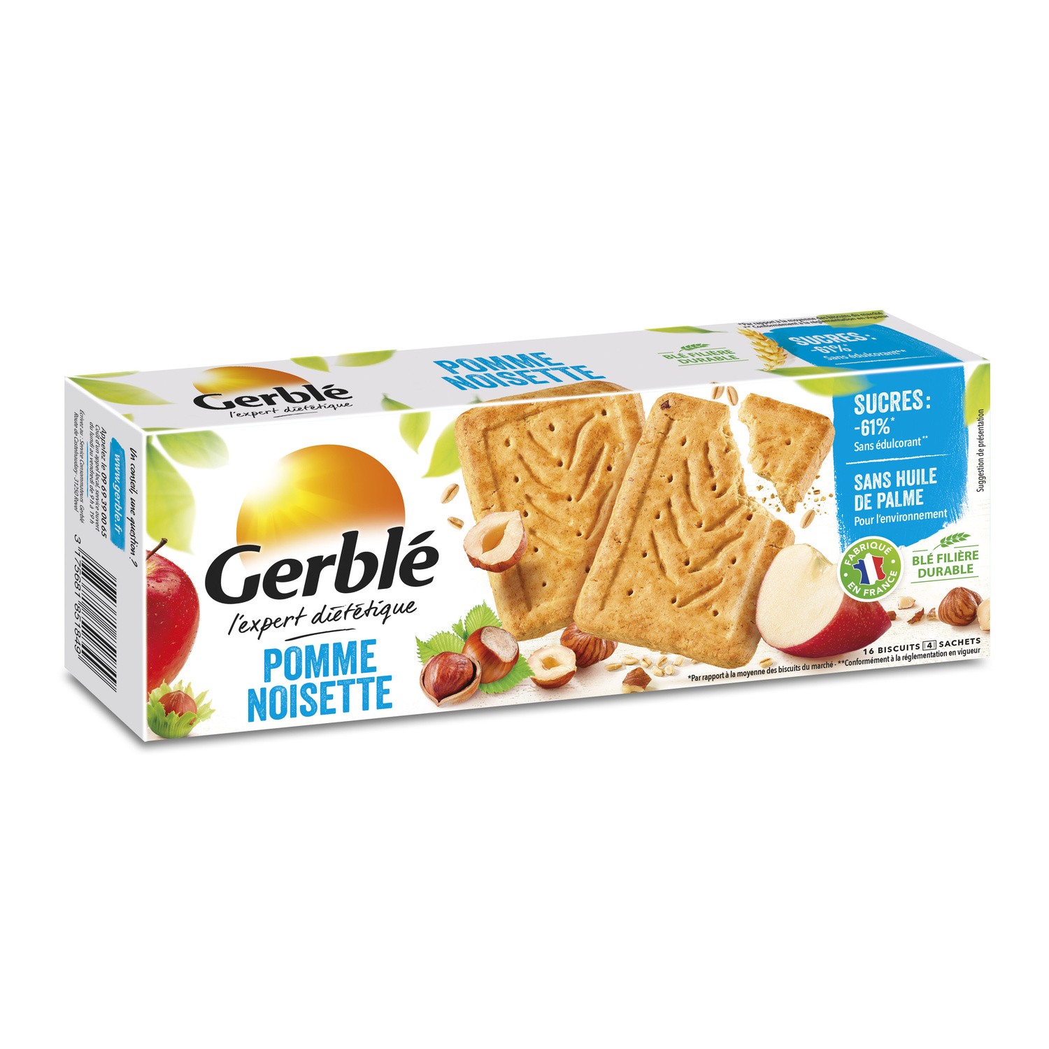 Biscuits. Ingrédients : Farine de blé 68,4%, huile de colza, sirop de sucres issu de fruits, jus concentré de pomme 5,3%, noisettes torréfiées 5.3% ,...