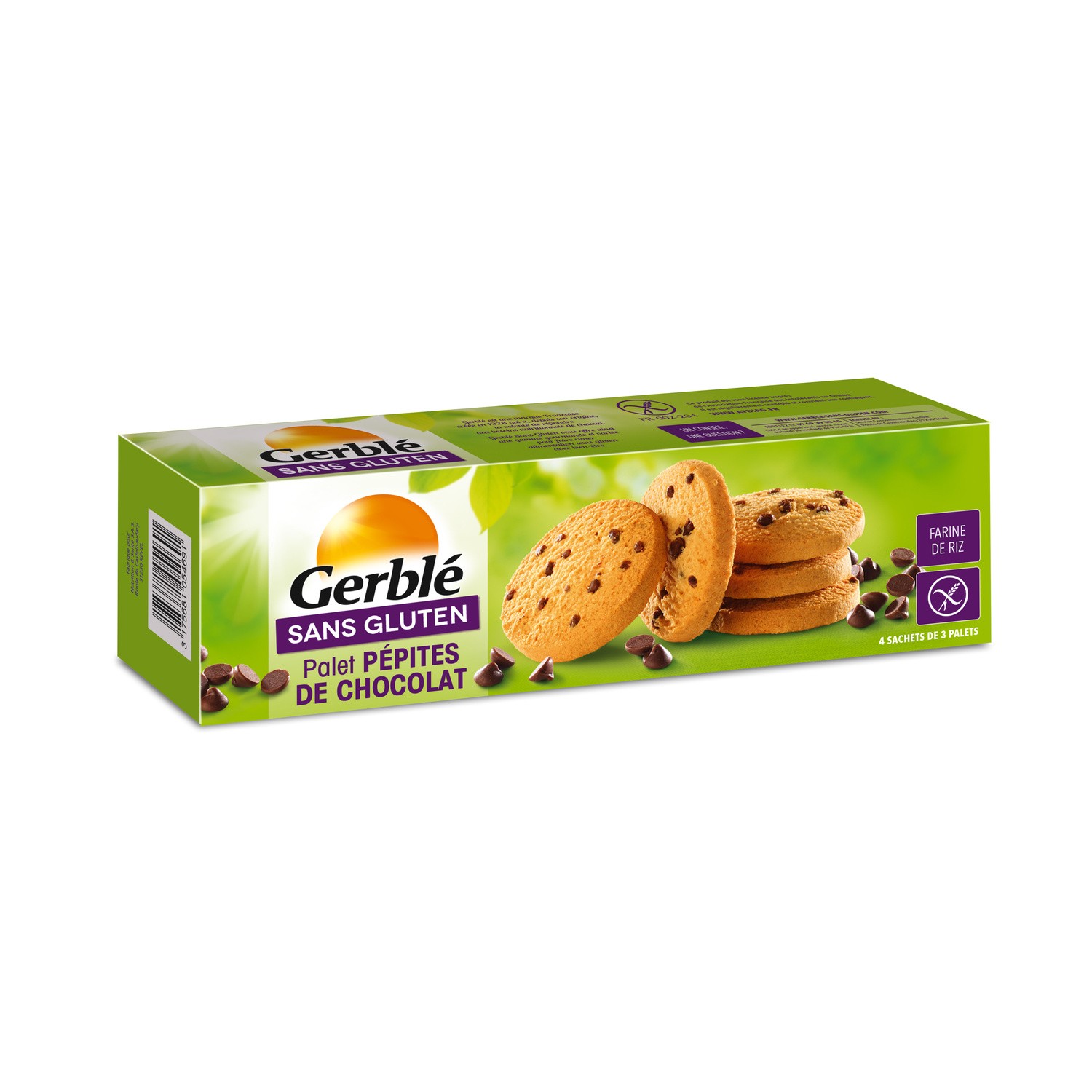 Palets pépites chocolat sans gluten. Ingrédients : Farine de riz, margarine (huiles végétales non hydrogénées, eau, sel, émulsifiants : (mono et diglycérides d'acides gras, lécithine),...