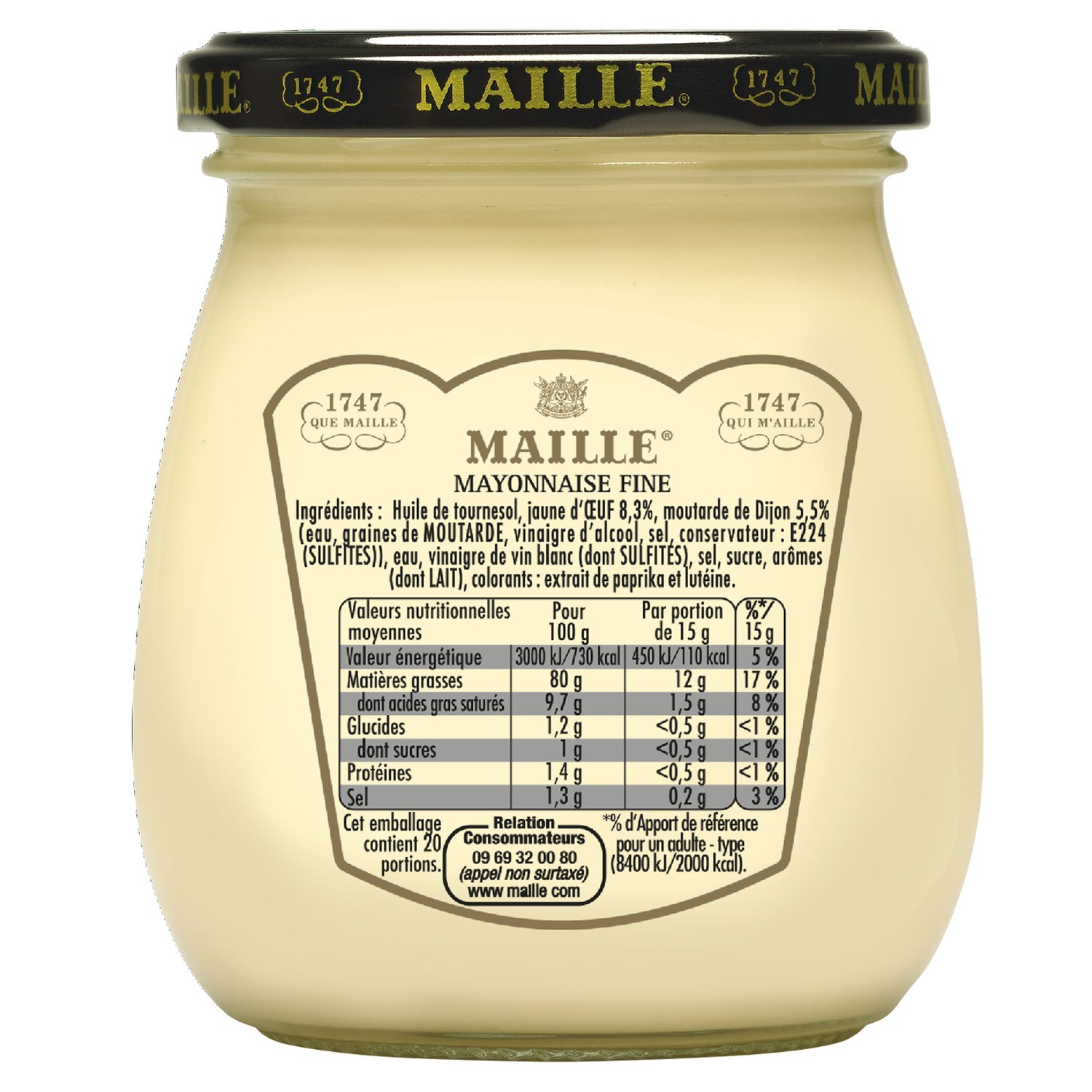 Mayonnaise fine.Ingrédients : Huile de tournesol, jaune d'OEUF 8,3%, moutarde de Dijon 5,5% (eau, graines de MOUTARDE, vinaigre d'alcool, sel, conservateur : E224 (SULFITES)), eau,...