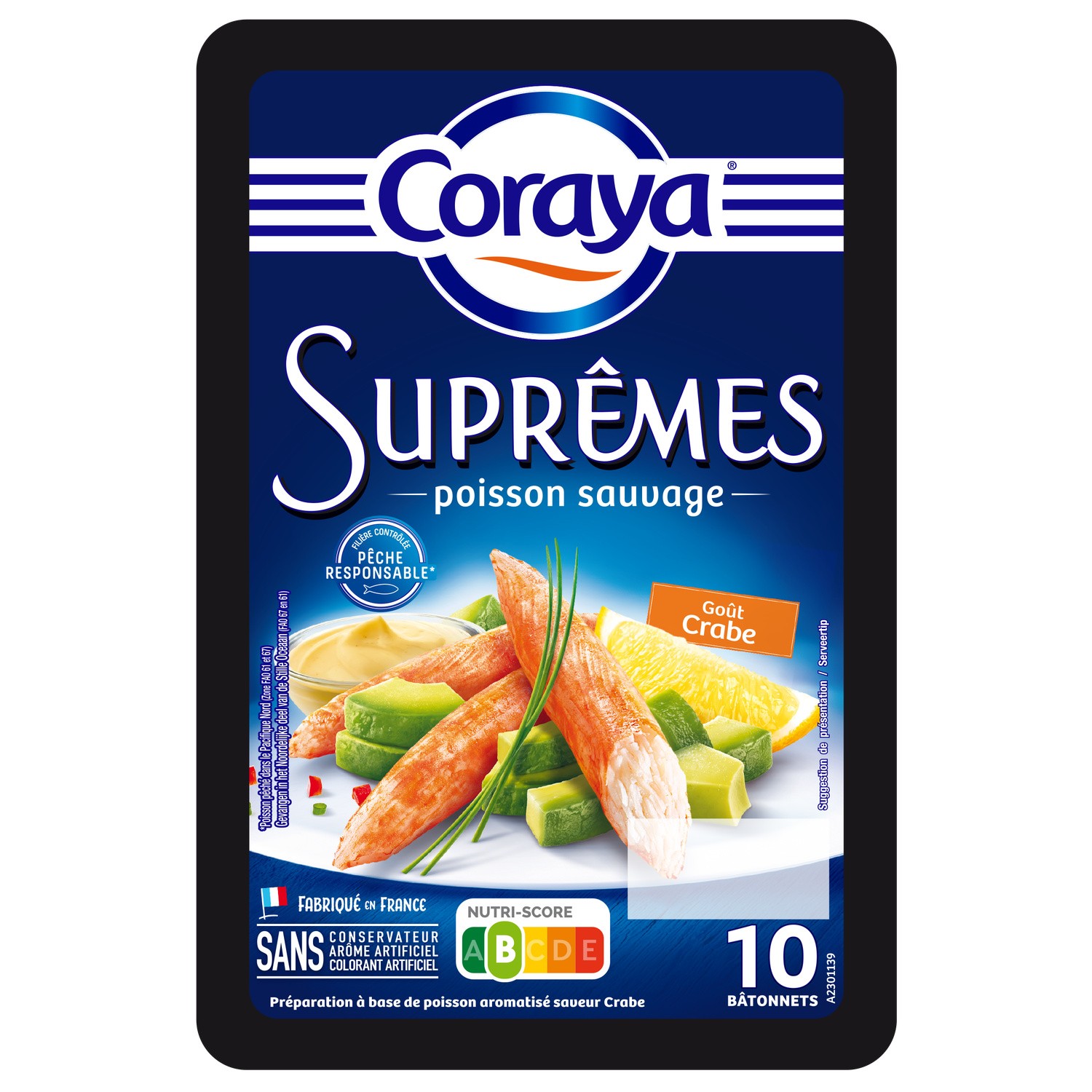 Préparation à base de chair de poisson goût crabe.Ingrédients : Chair de _poisson_ (38 %), eau, blanc d'_oeuf_ réhydraté, fécules (dont _blé_), sucre, jaune d'_oeuf_...