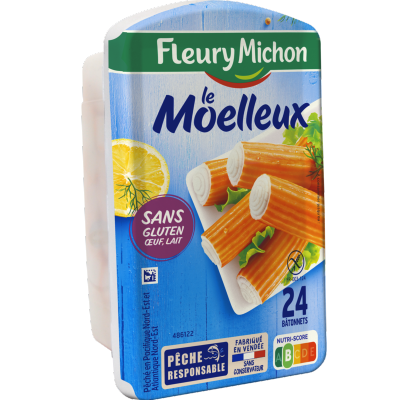 Le bâtonnet Moelleux sans gluten - 24 bâtonnets.Ingrédients : Chair de _poisson_ * 42 %, eau, fécule de pomme de terre et amidon de maïs,...