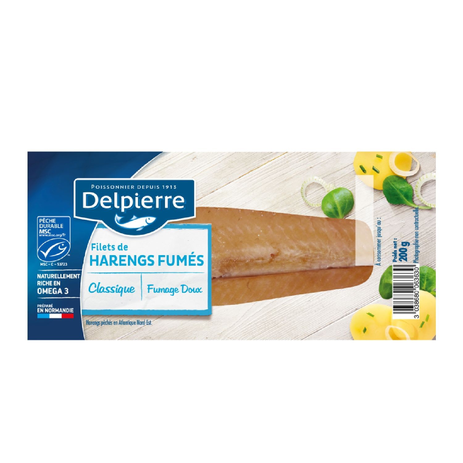 Filets de harengs fumés doux au bois de hêtre.Quantité : 200 gMarque : Delpierre