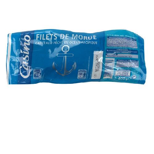 FILETS DE MORUE (CABILLAUD SALE).Ingrédients : _cabillaud_ (Gadus macrocephalus ou Gadus morhua)* 86% - sel - eau.*la lettre située à côté du numéro de lot...