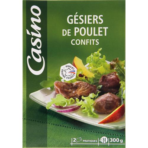Gésiers de poulet confits.Ingrédients : Gésiers de poulet confits à la graisse de canard 85% (gésiers de poulet origine France 95% - sel - arômes...