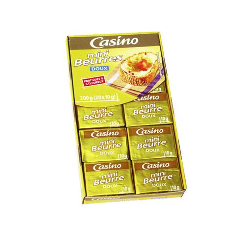 Beurre pasteurisé doux à 82% de matières grasses.Ingrédients : _beurre._ lait origine : france.Quantité : 200 g (20 x 10 g)Marque : Casino