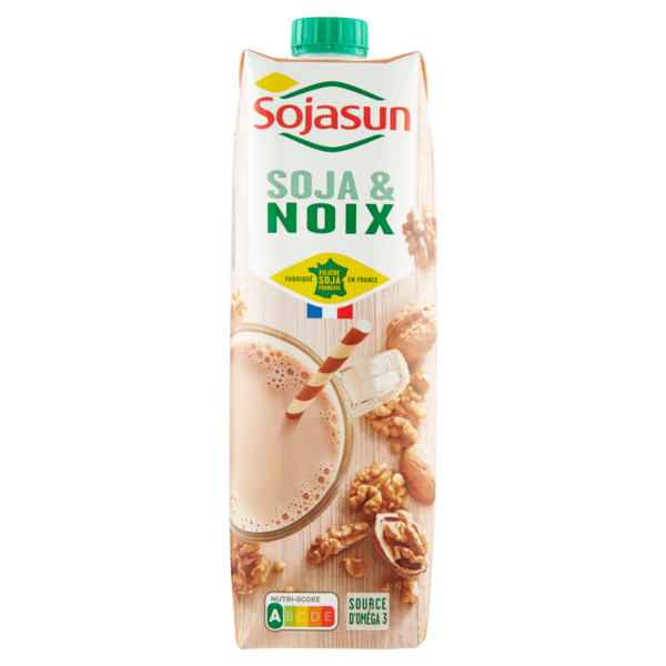 Boisson de soja à la noix, riche en calcium, stérilisée UHT.Ingrédients : Jus de soja 93% (eau, graines de soja* 5%), sucre, noix 2%, phosphate...