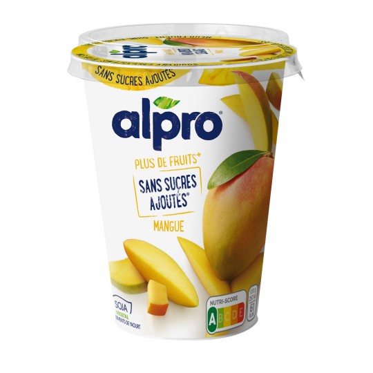 Produit fermenté au soja, mangue, aromatisé, avec calcium et vitamines ajoutés.Ingrédients : base de _soja_ (eau, fèves de soja sans OGM décortiquées (9,7%)), mangue (17,7%)...