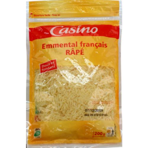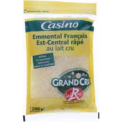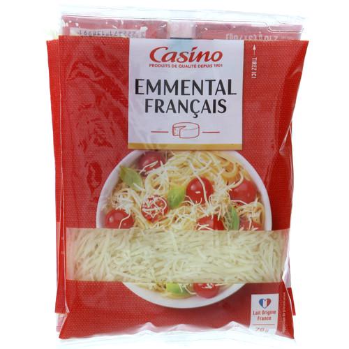 Emmental français râpé - Fromage à pâte pressée cuite. Ingrédients : _lait_ de vache pasteurisé (origine : france) - sel - ferments lactiques (contient _lait_)...