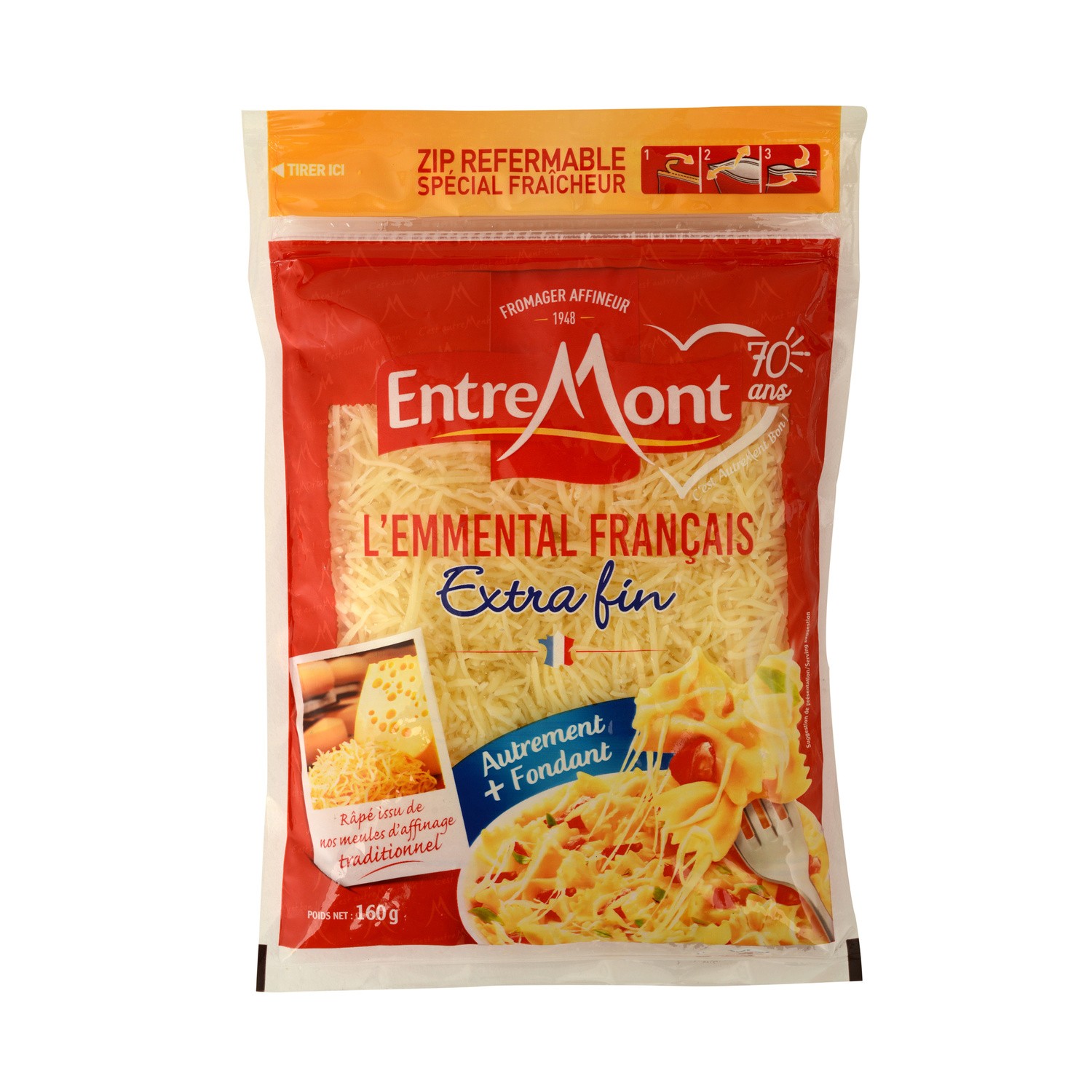 Emmental français. Râpé. Fromage à pâte préssée cuite. Ingrédients : _Lait_, sel, ferments lactiques Quantité : 160 g Marque : Entremont Origine : France