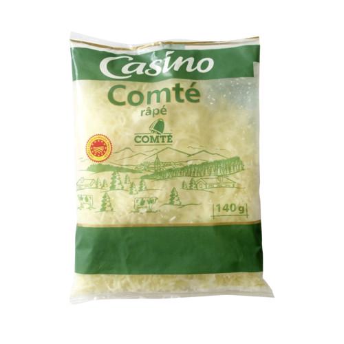 Comté râpé. Fromage à pâte pressée cuite. Ingrédients : _Lait_ cru de vache - sel - ferments lactiques - présure animale. Quantité : 140 g...