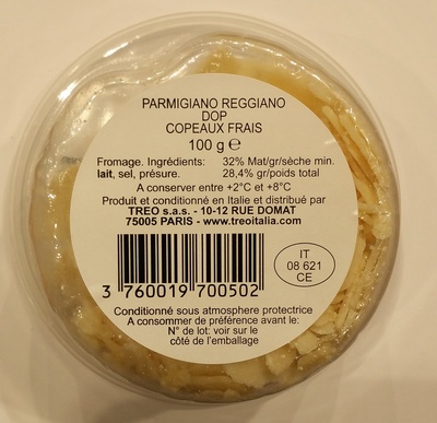 Parmigiano Reggiano DOP Copeaux Frais. Ingrédients : _lait_, sel, présure. Quantité : 100 g Marque : Treo,Treo SAS