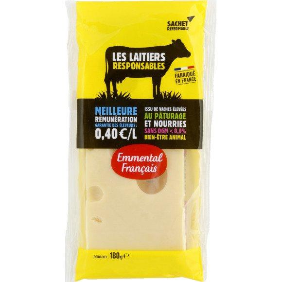 Emmental francais. Ingrédients : lait (Origine : France), sel, ferments lactiques. Quantité : 180 g Marque : Les Laitiers Responsables,Entremont Origine : France