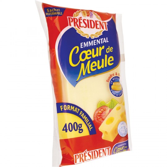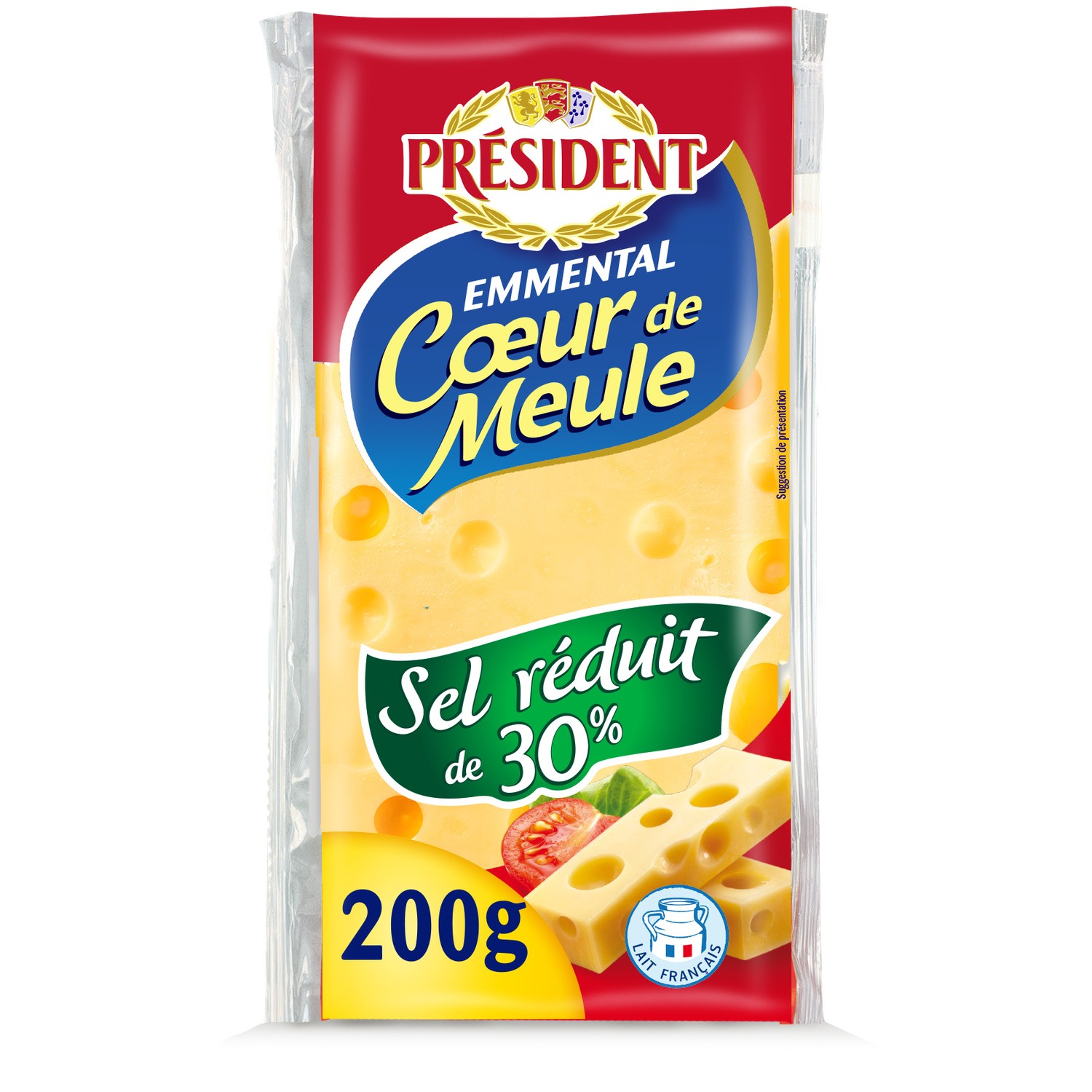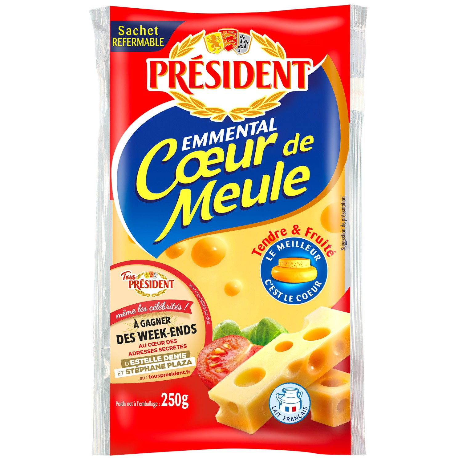 Emmental Cœur de Meule. Ingrédients : _Lait_, sel, ferments Quantité : 250 g Marque : President Origine : France