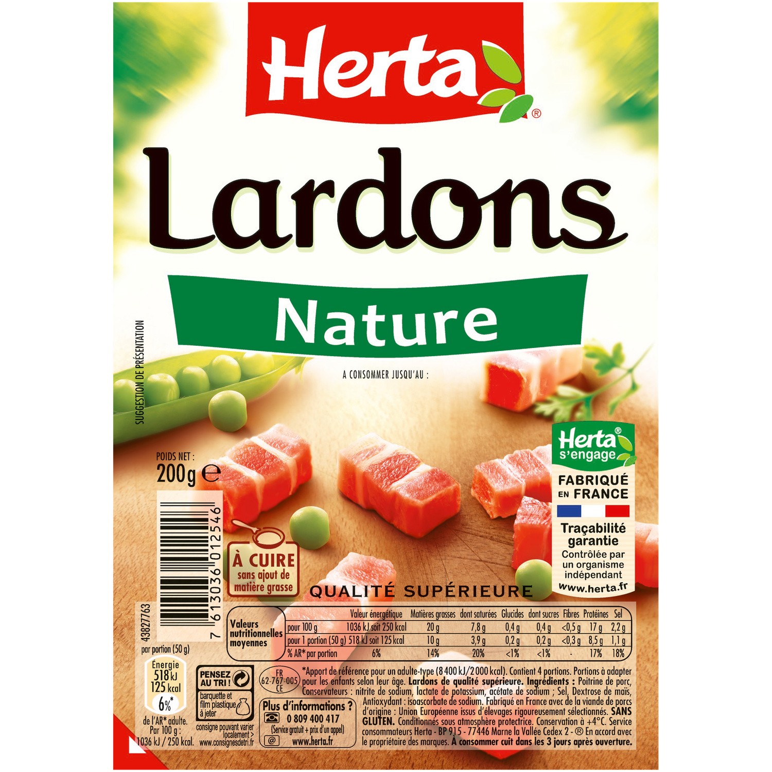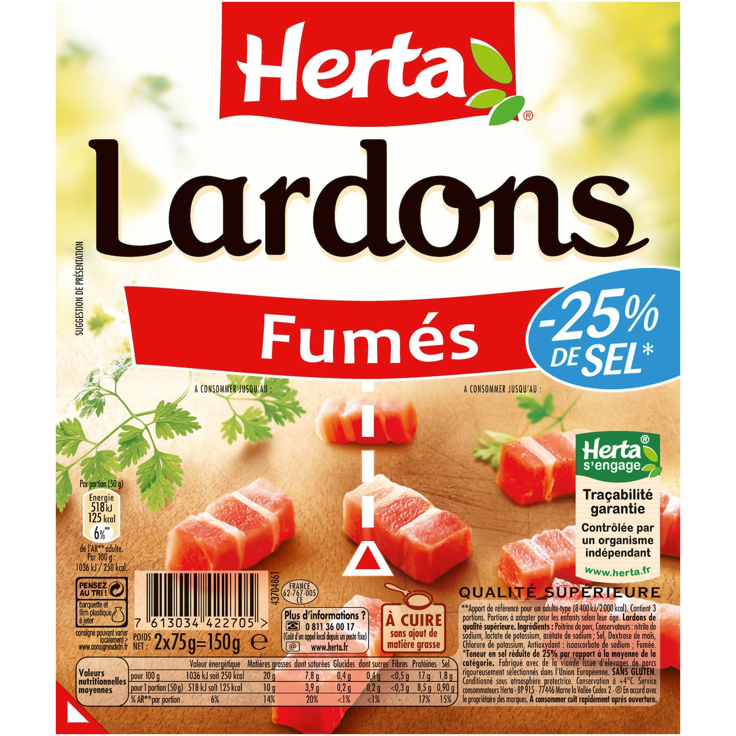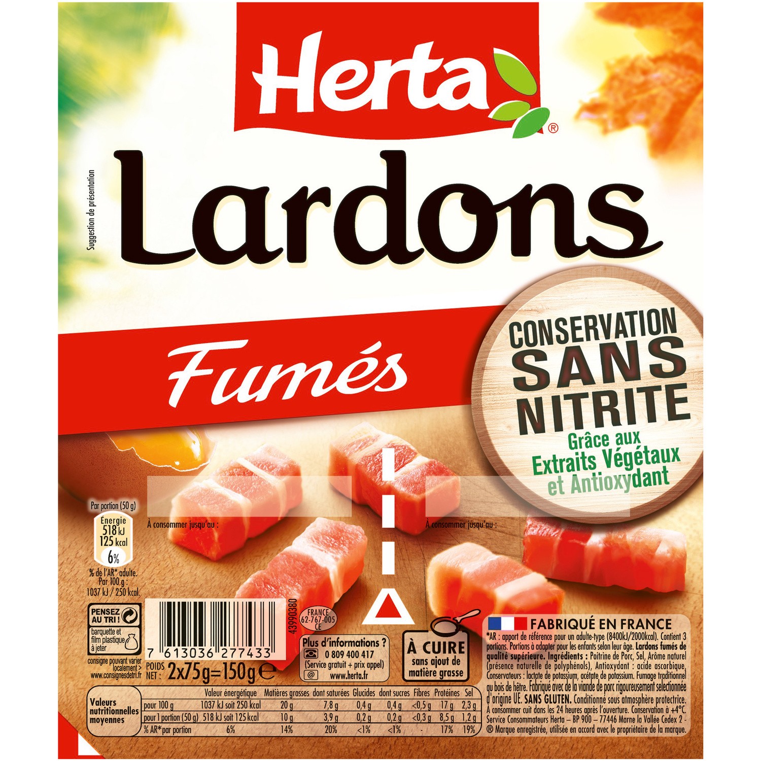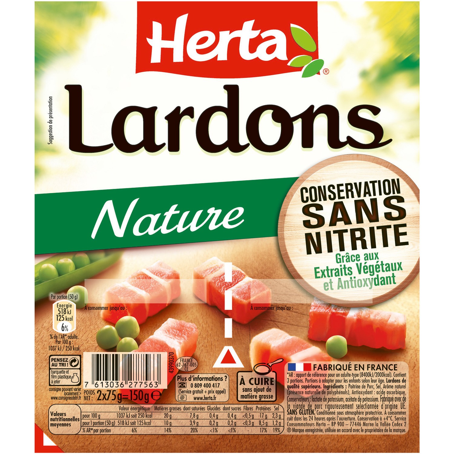 Lardons. Ingrédients : poitrine de porc, sel, arôme naturel, conservateurs : lactate de potassium, acétate de potassium Quantité : 150g (2x75g) Marque : Herta