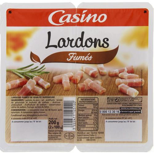 Lardons fumés (-25 % de sel). Ingrédients : Poitrine de porc, conservateurs : nitrite de sodium, lactate de potassium, acétate de sodium, sel, dextrose de...