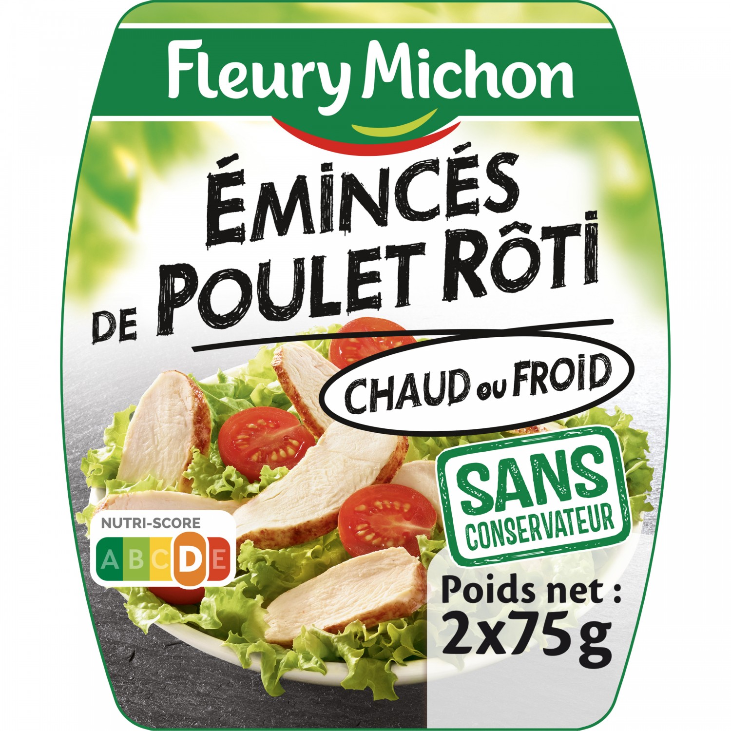 Emincés de poulet rôti 2 x 75 g. Ingrédients : Cuisse de poulet 83%, bouillons (eau, os de poulet, sel, ail, plantes aromatiques, épices), acidifiant...