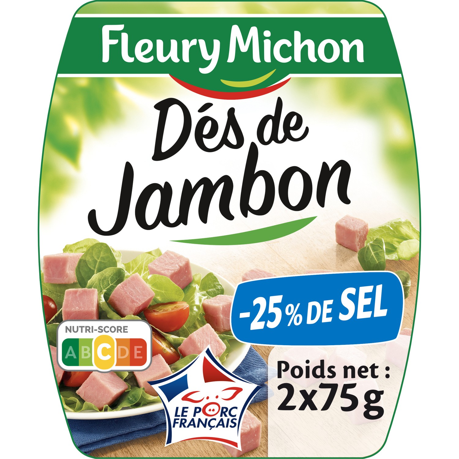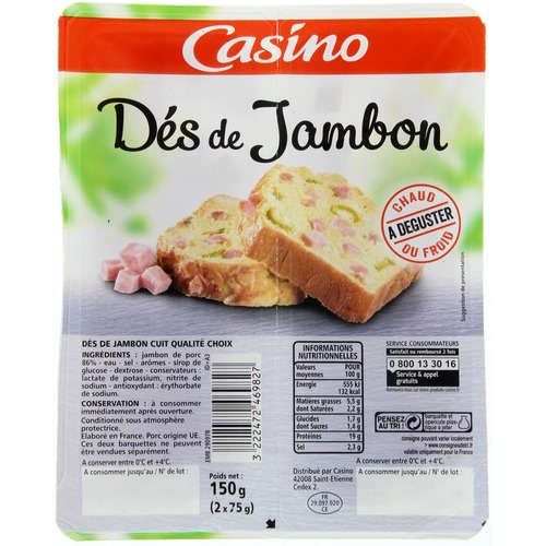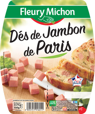 Dés de jambon de Paris - 2x75g.. Ingrédients : Jambon de porc, acidifiant : lactate de potassium, dextrose de maïs, sel, bouillon (eau, épices, plantes...
