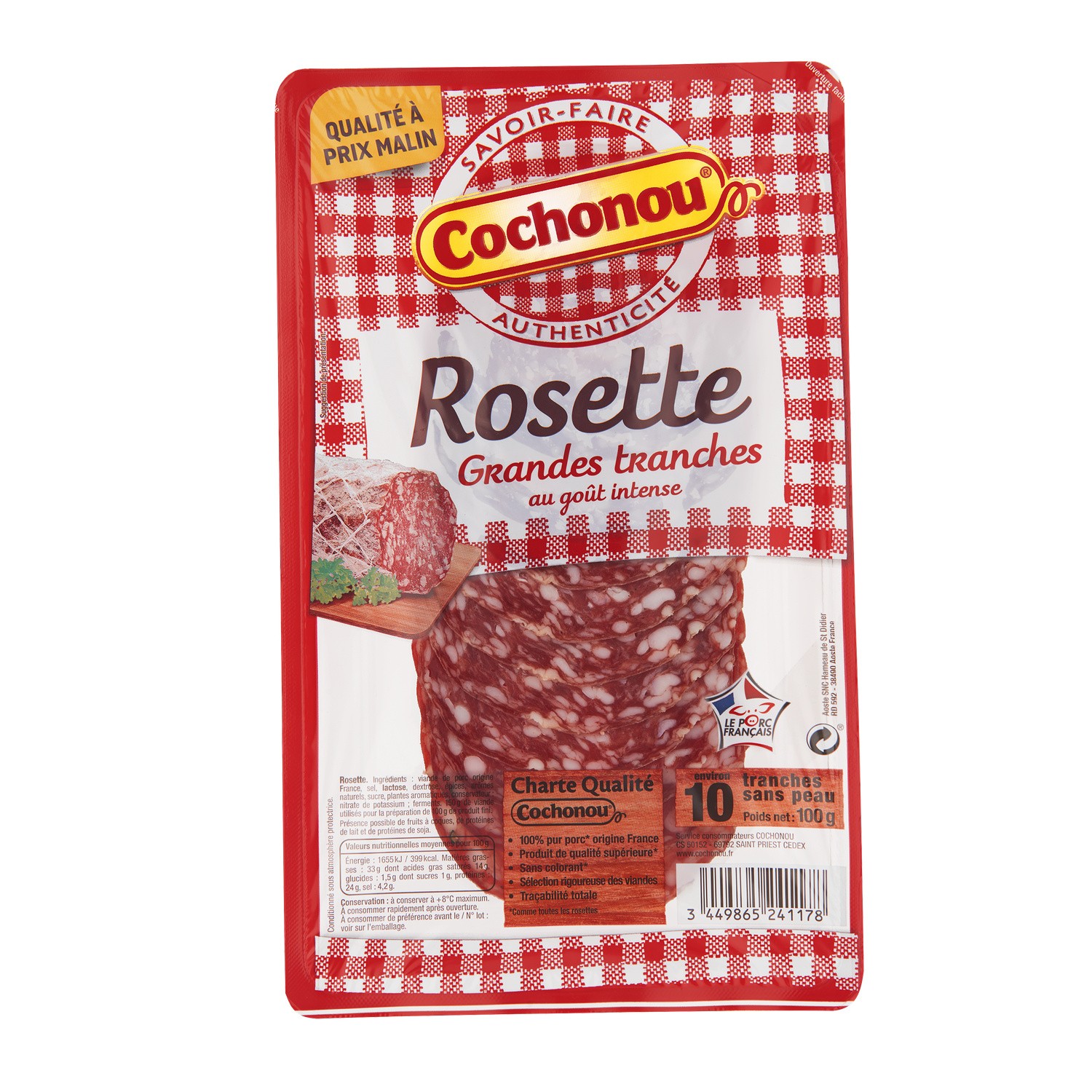 Rosette. Ingrédients : viande de porc origine France, se lactose, épices, dextrose, sucre, alcools (rhum, vin macardan, arômes naturels) Conservateurs : nitrate de potassium, acide...