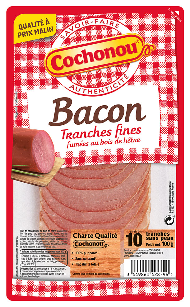 Filet de bacon fumé au bois de hêtre. Ingrédients : Filet de porc (origine : UE) - sel - dextrose - conservateurs : nitrite de...